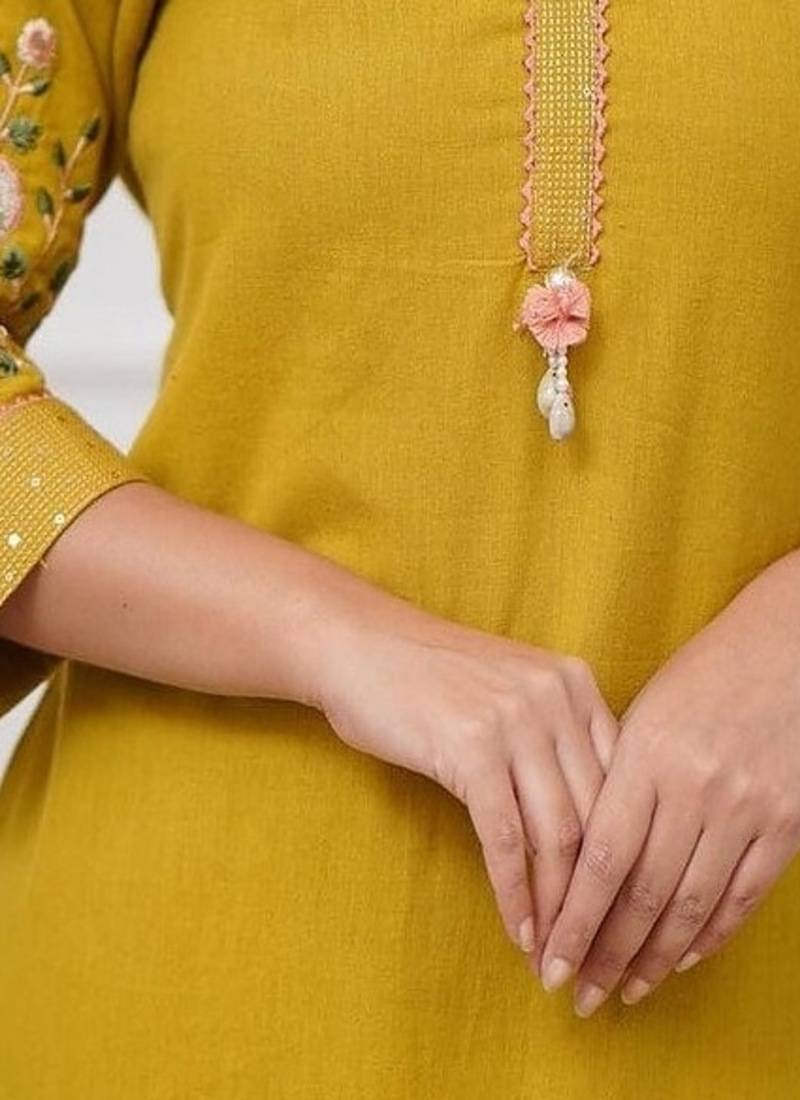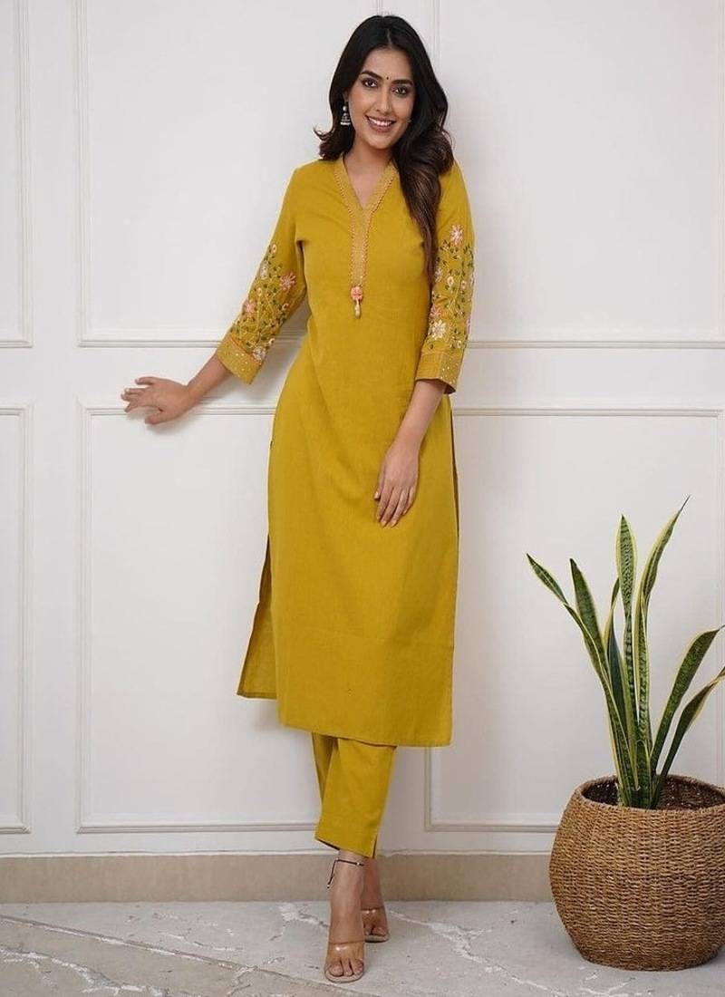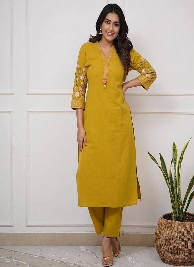 The Kurta Showcases Delicate Floral Embroidery On The Neckline/Front, Adding A Refined And Feminine Touch. Paired With Matching Comfortable Cotton Trousers, This 2 Piece Set Creates A Polished Ethnic Look That Is Perfect For Office Wear, Casual Outings, Or Small Gatherings.