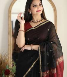 Black red soft linen blend banarasi jacuard work designer party wear saree with unstitched blouse piece