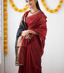 Maroon black soft linen blend banarasi jacuard work designer party wear saree with unstitched blouse piece