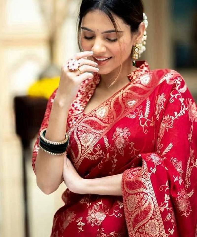 Product Name Red Soft Silk Blend Banarasi Jacuard Work Designer Party Wear Saree With Unstitched Blouse Piece