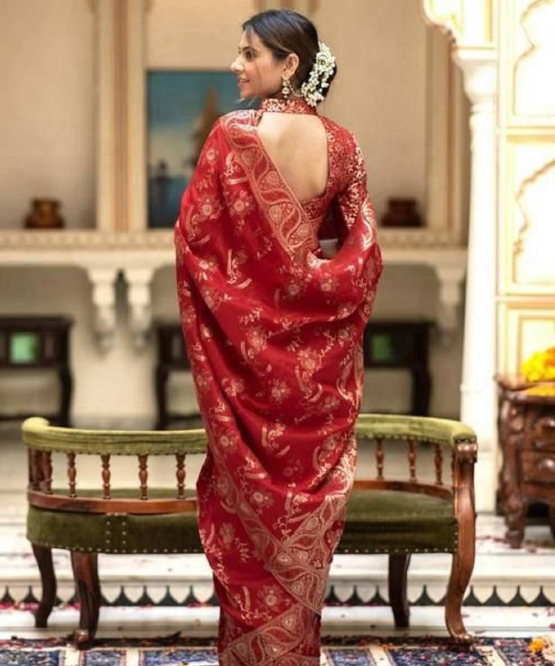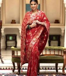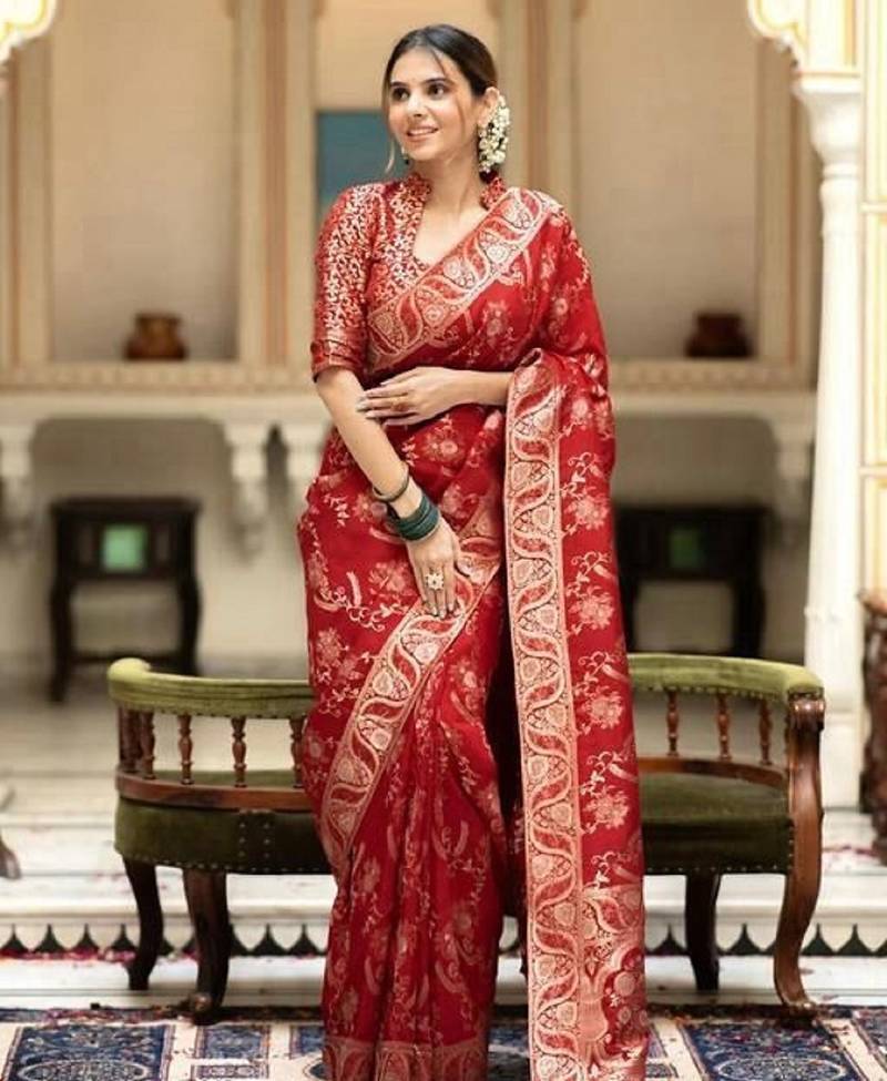 Red soft silk blend banarasi jacuard work designer party wear saree with unstitched blouse piece