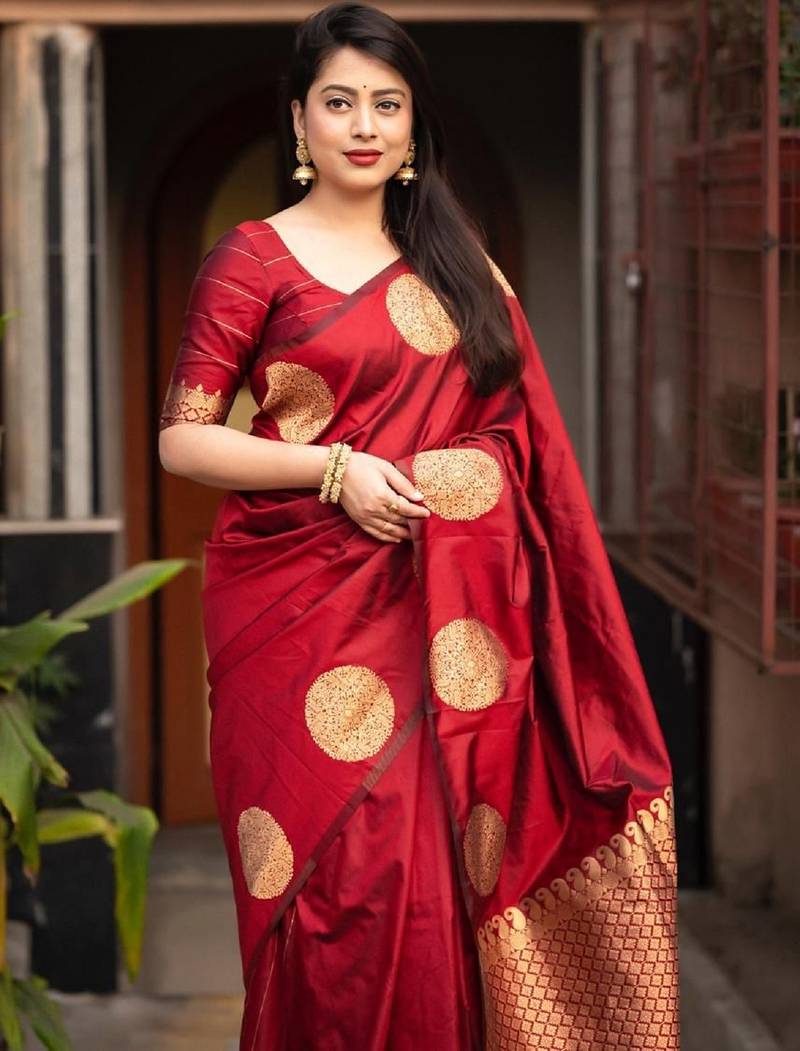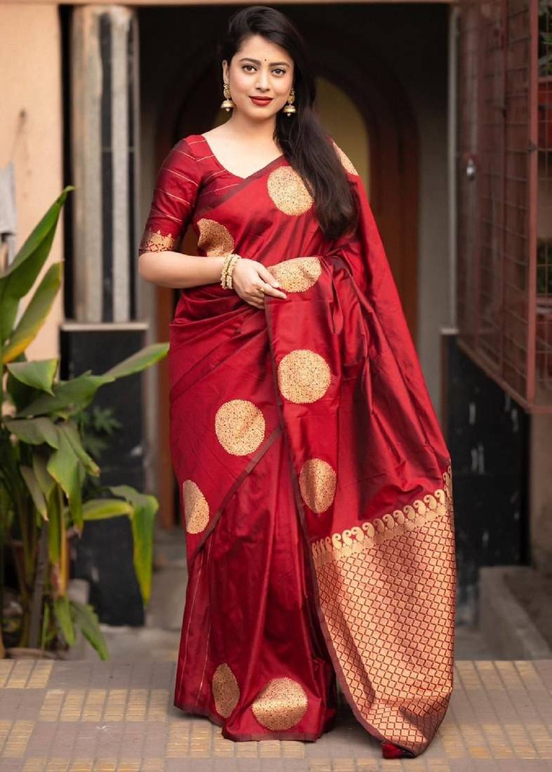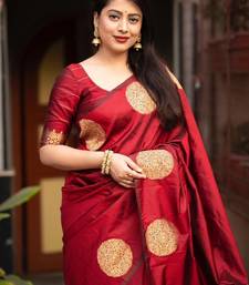 Red soft silk blend banarasi jacuard work designer party wear saree with unstitched blouse piece