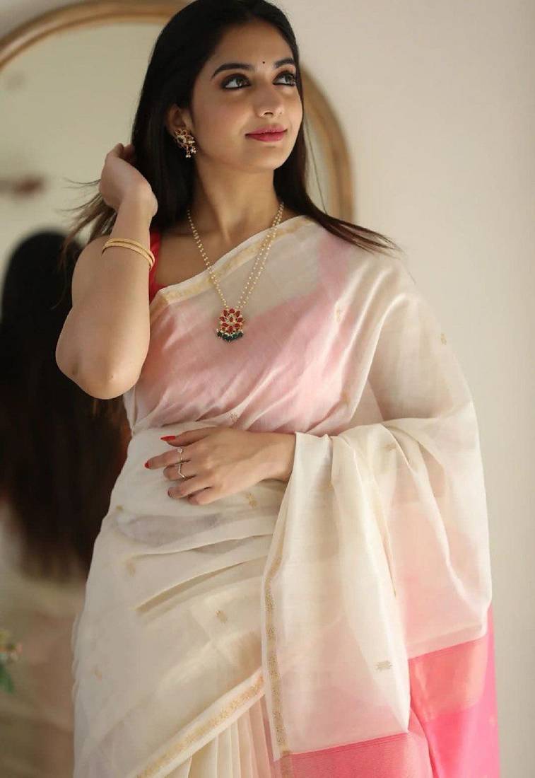 | Product Name | White Pink Soft Linen Blend Banarasi Jacuard Work Designer Party Wear Saree With Unstitched Blouse Piece | |
