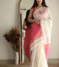 White pink soft linen blend banarasi jacuard work designer party wear saree with unstitched blouse piece