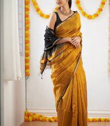 Yellow black soft linen blend banarasi jacuard work designer party wear saree with unstitched blouse piece