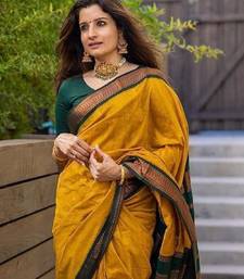 Yellow green soft silk blend banarasi jacuard work designer party wear saree with unstitched blouse piece