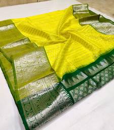 Yellow green soft silk blend banarasi jacuard work designer party wear saree with unstitched blouse piece