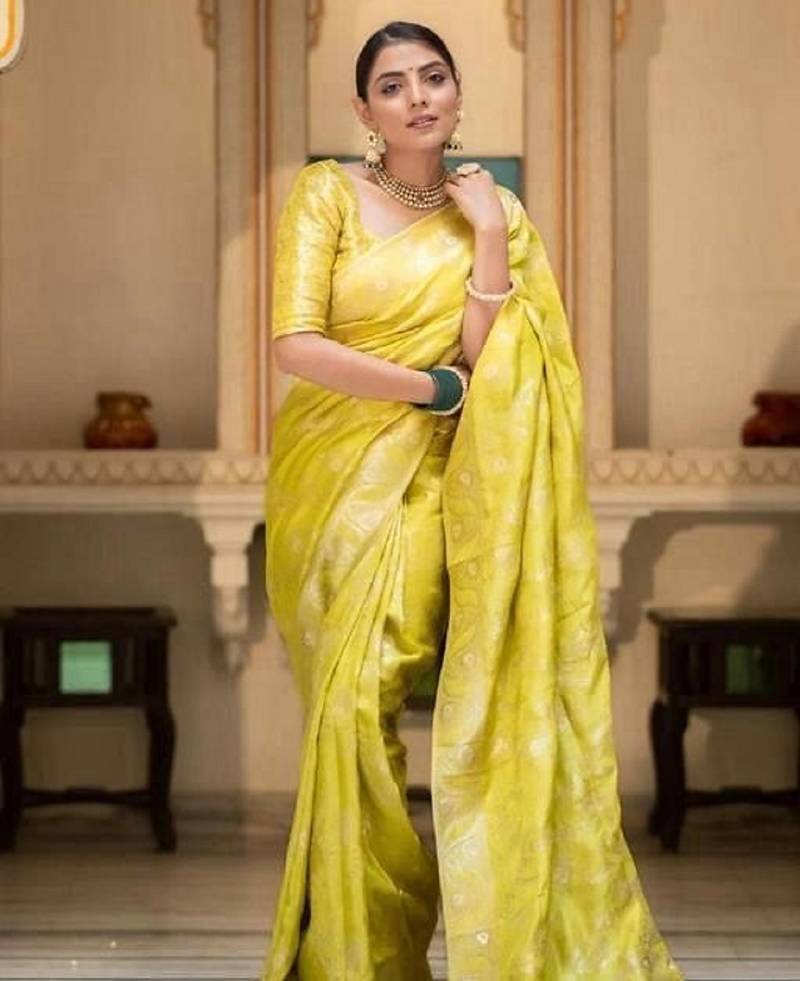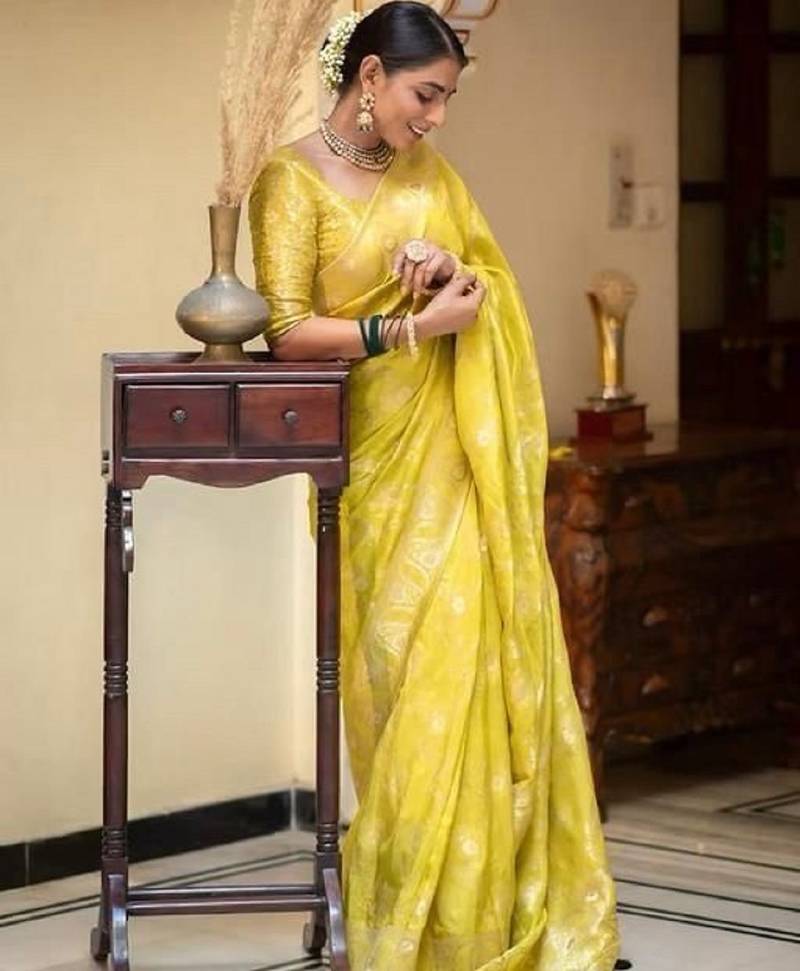 Yellow soft silk blend banarasi jacuard work designer party wear saree with unstitched blouse piece