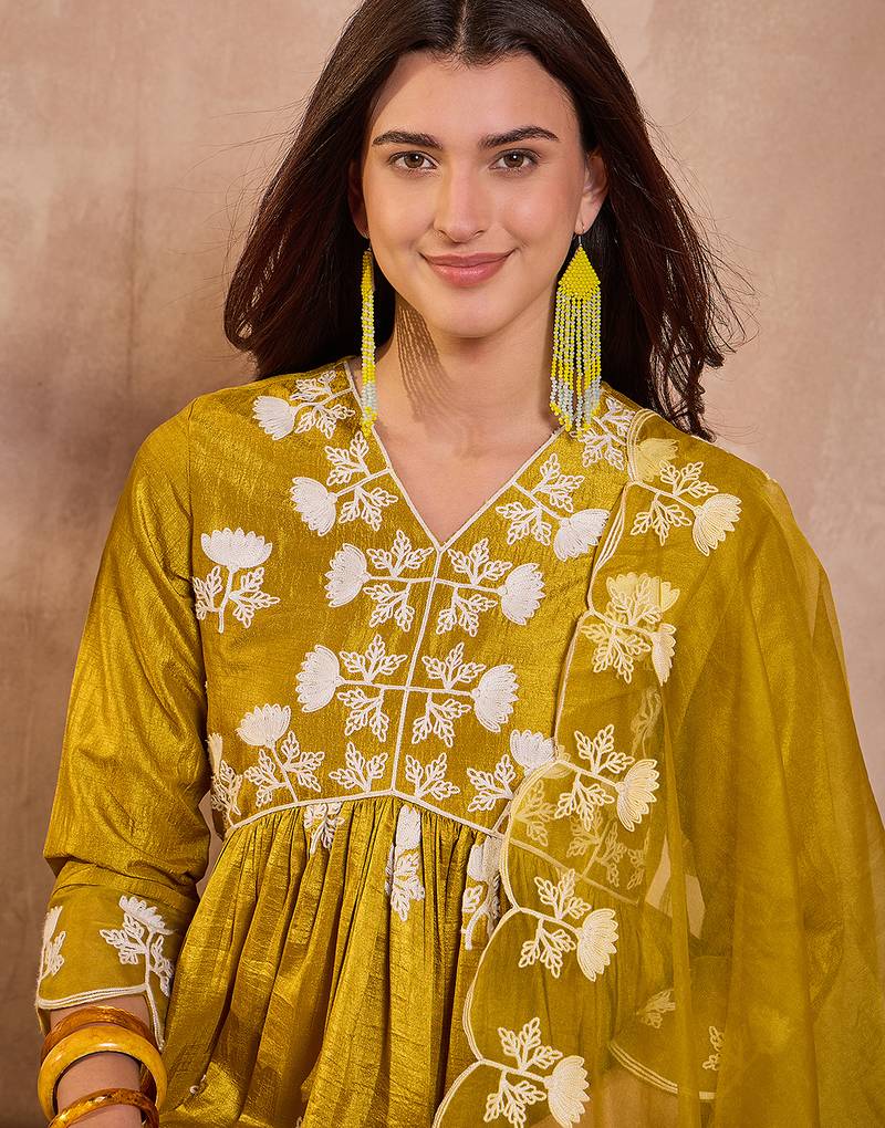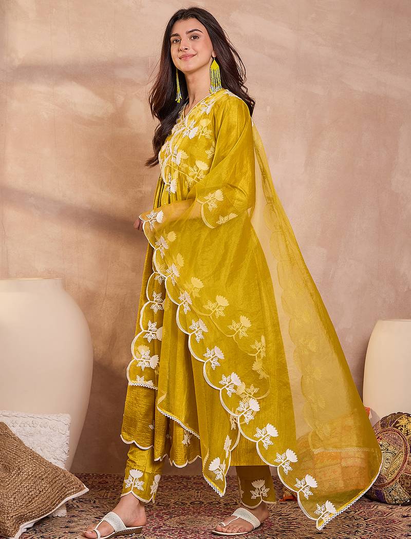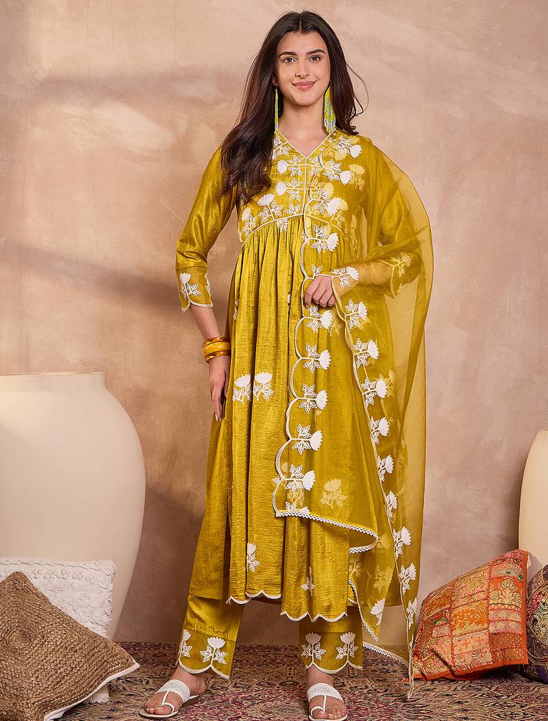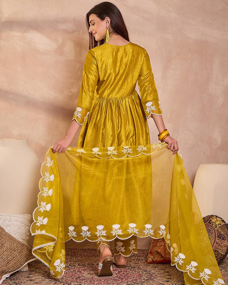 | Product Name | Women Mustard Silk Blend Solid Embroidered A Line Kurta Trouser With Dupatta | |