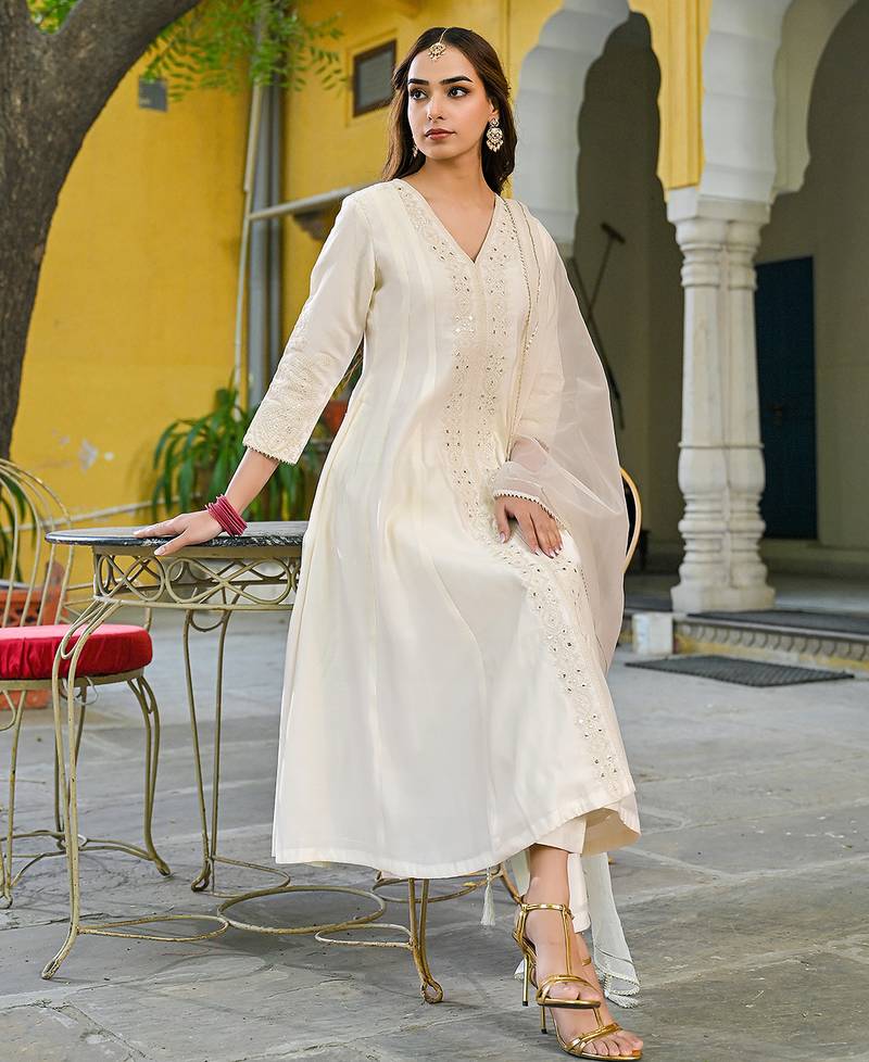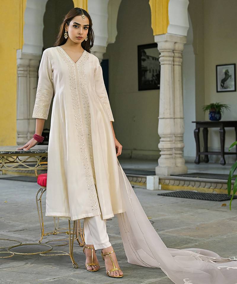 Women off white silk blend solid embroidered a-line kurta trousers with dupatta