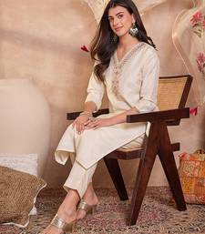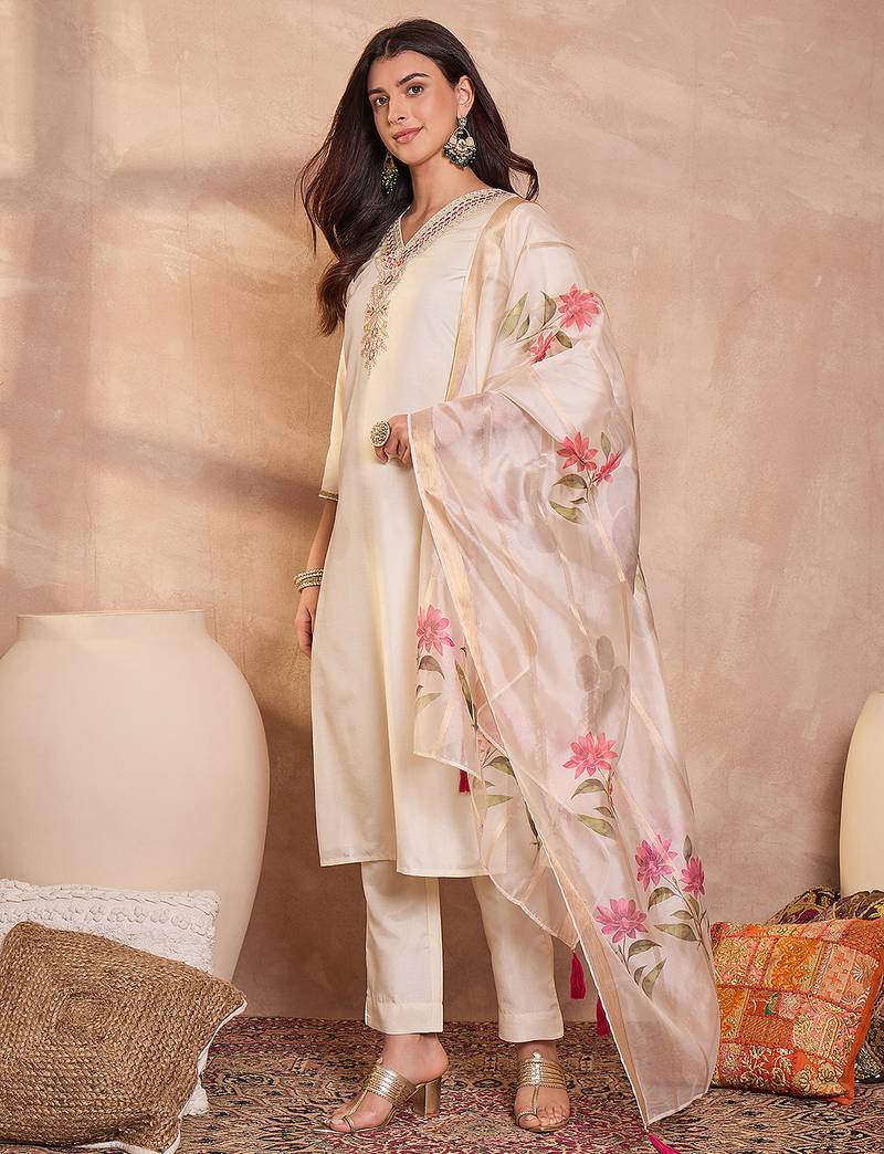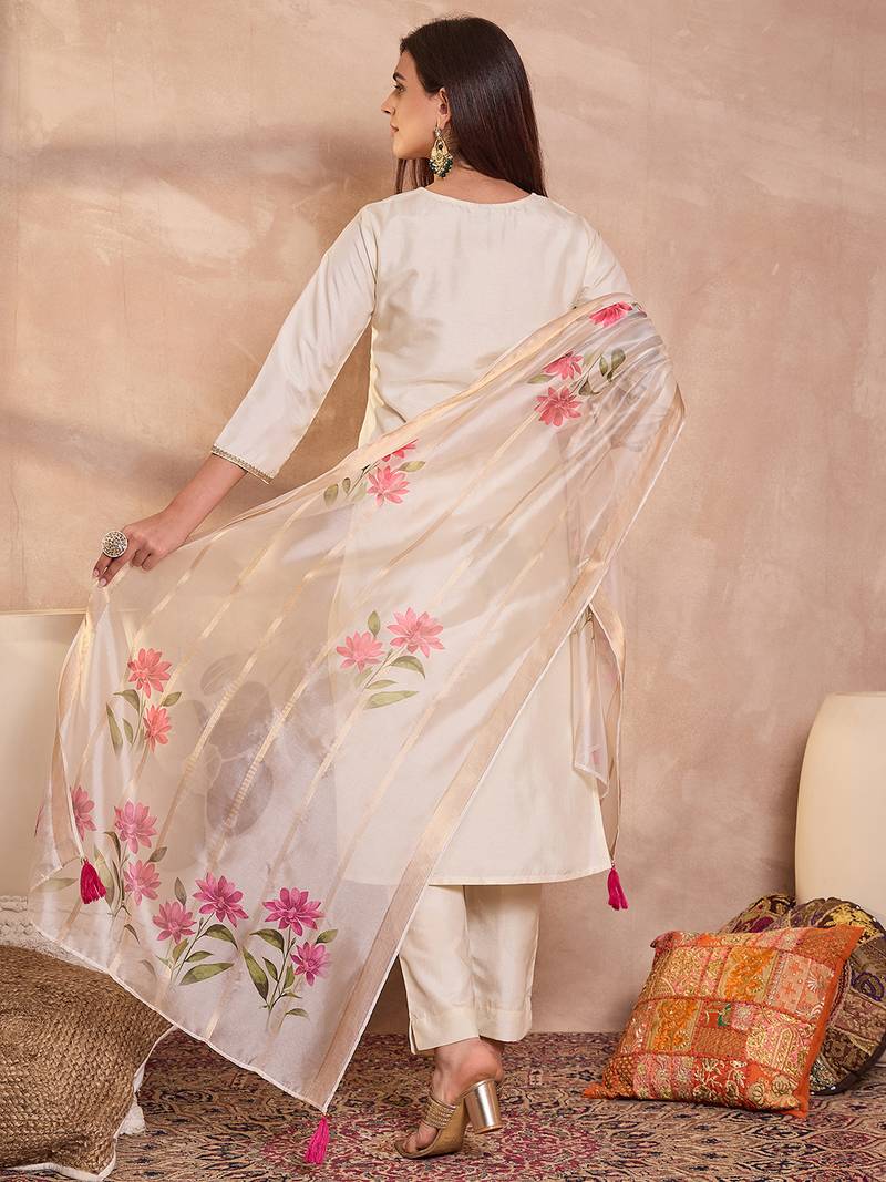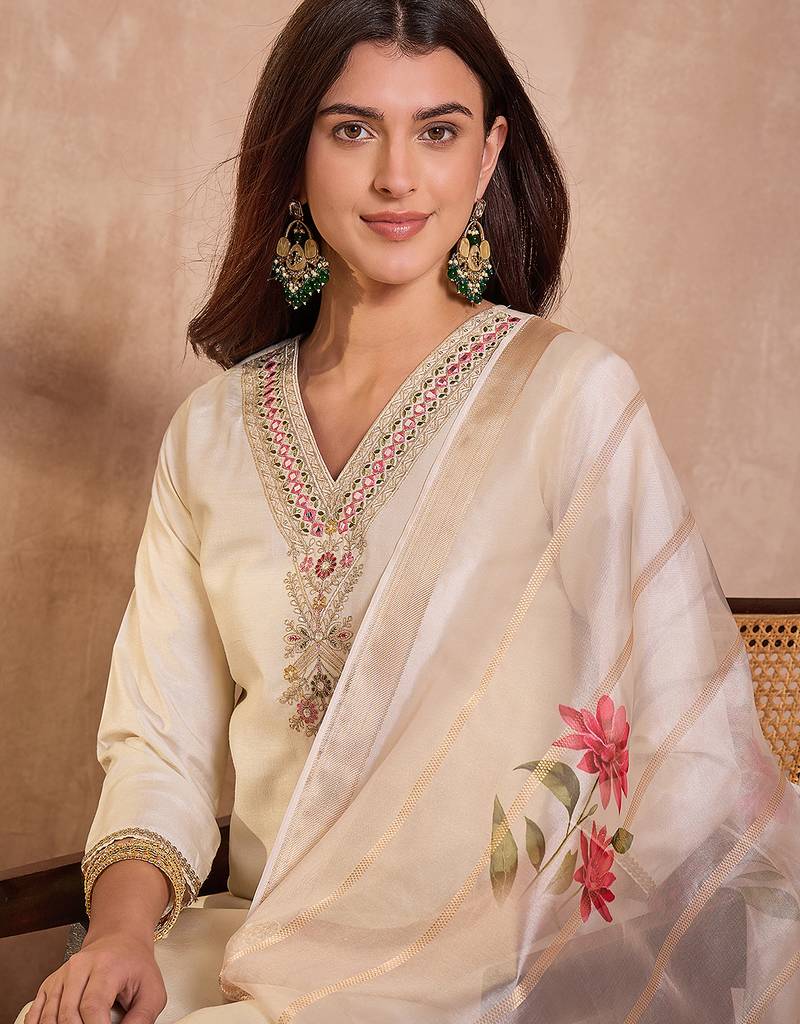 Women off white silk blend solid embroidered straight kurta trouser with dupatta