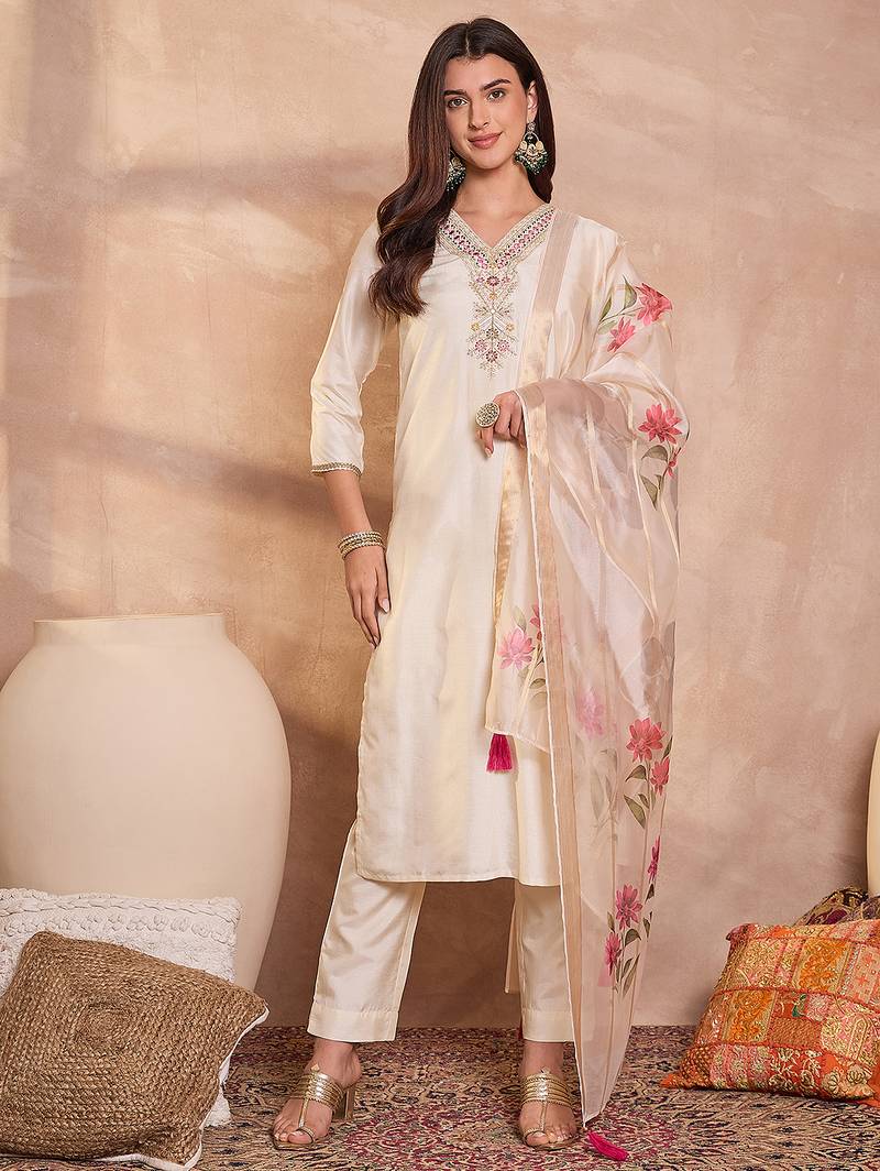 | Product Name | Women Off White Silk Blend Solid Embroidered Straight Kurta Trouser With Dupatta | |