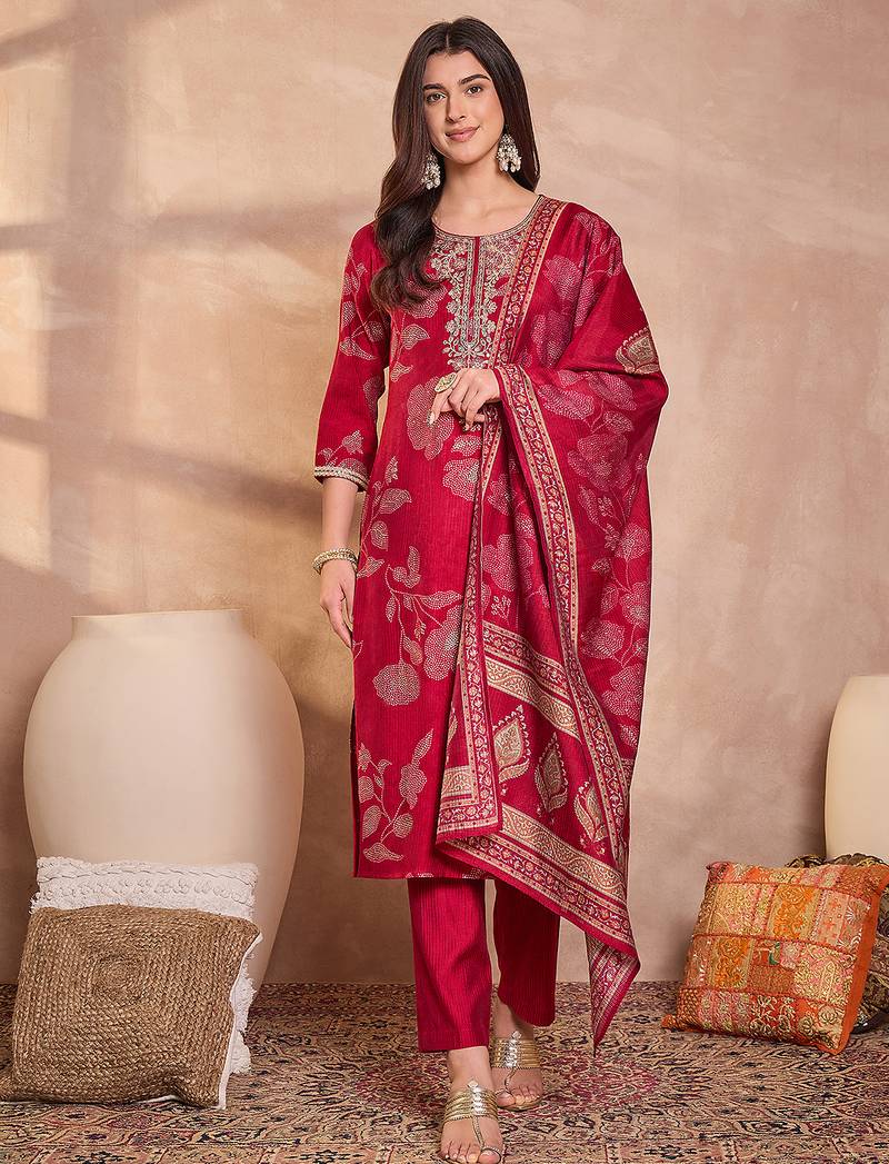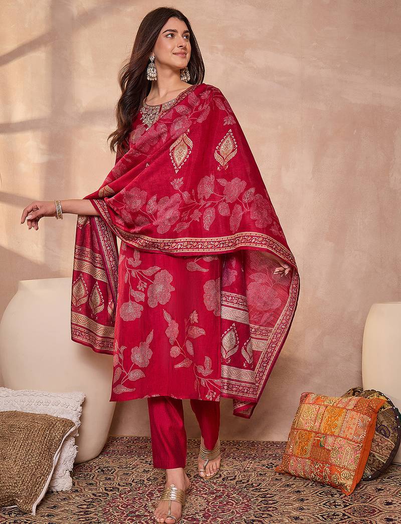 | Product Name | Women Pink Silk Blend Floral Printed Straight Kurta Trouser With Dupatta | |