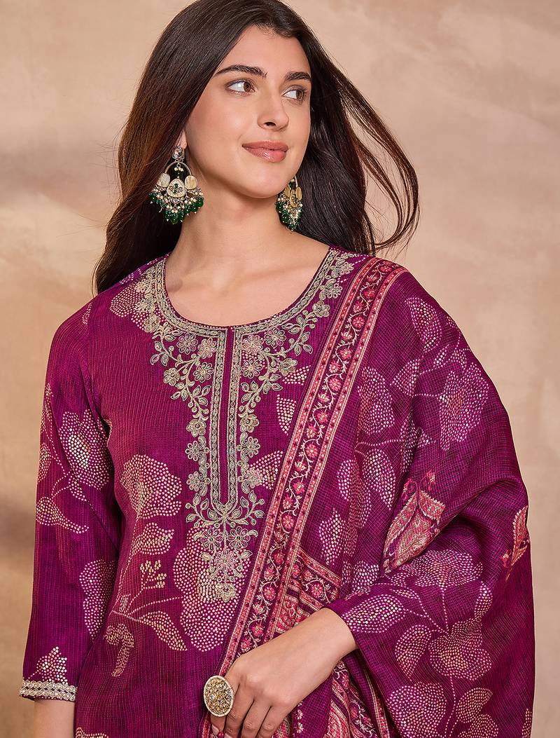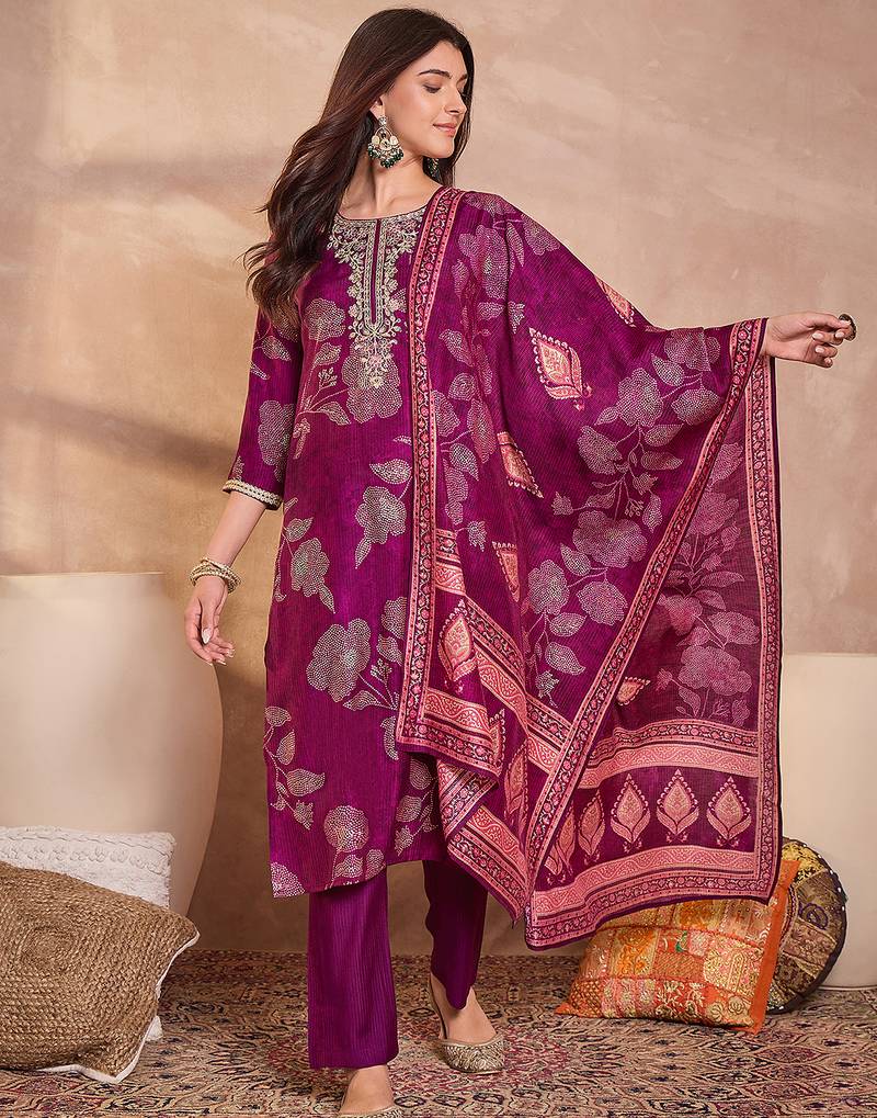 | Product Name | Women Purple Silk Blend Floral Printed Straight Kurta Trouser With Dupatta | |
