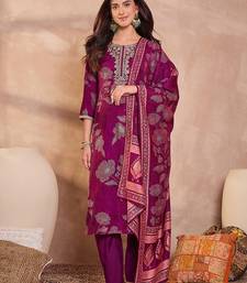 Women purple silk blend floral printed straight kurta trouser with dupatta