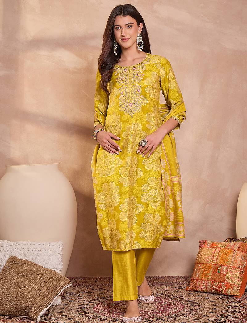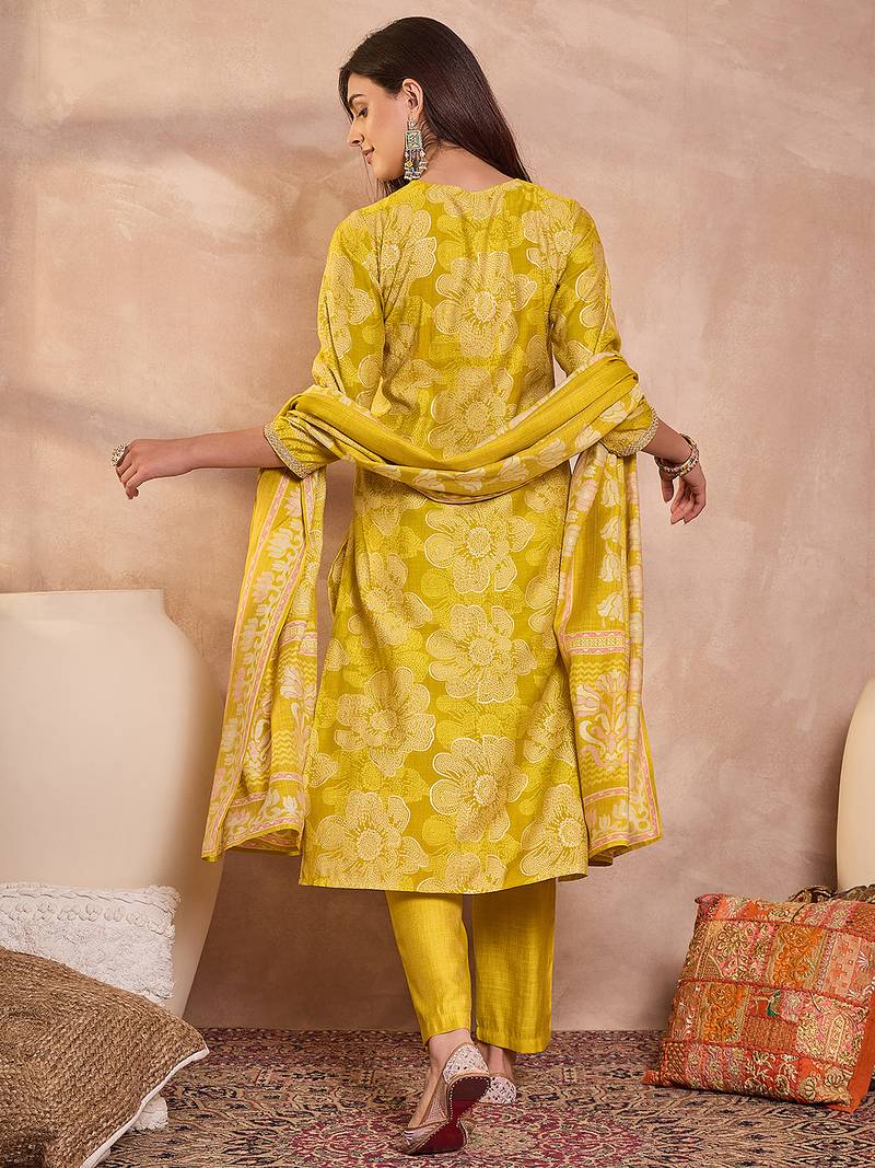 | Product Name | Women Yellow Floral Printed Straight Kurta Trouser With Dupatta | |