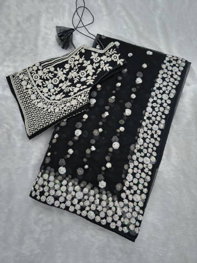Black color embroidery and sequins work with full hand pearl work butterfly soft net saree