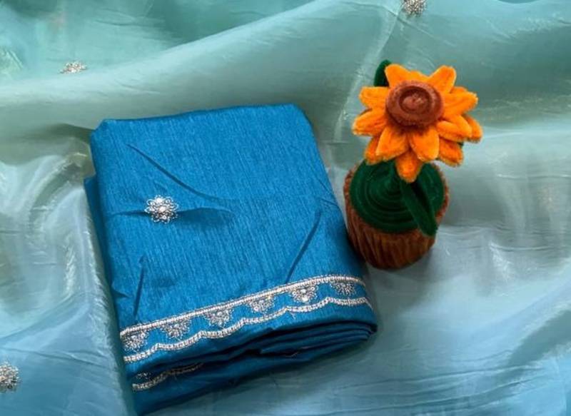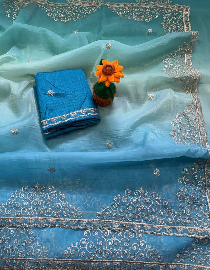 Product Name Blue Color Sequence With Gold Zari Thread Work And Cut Work Border Silk Saree