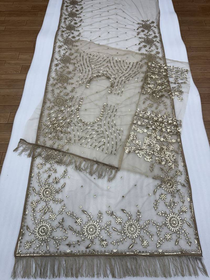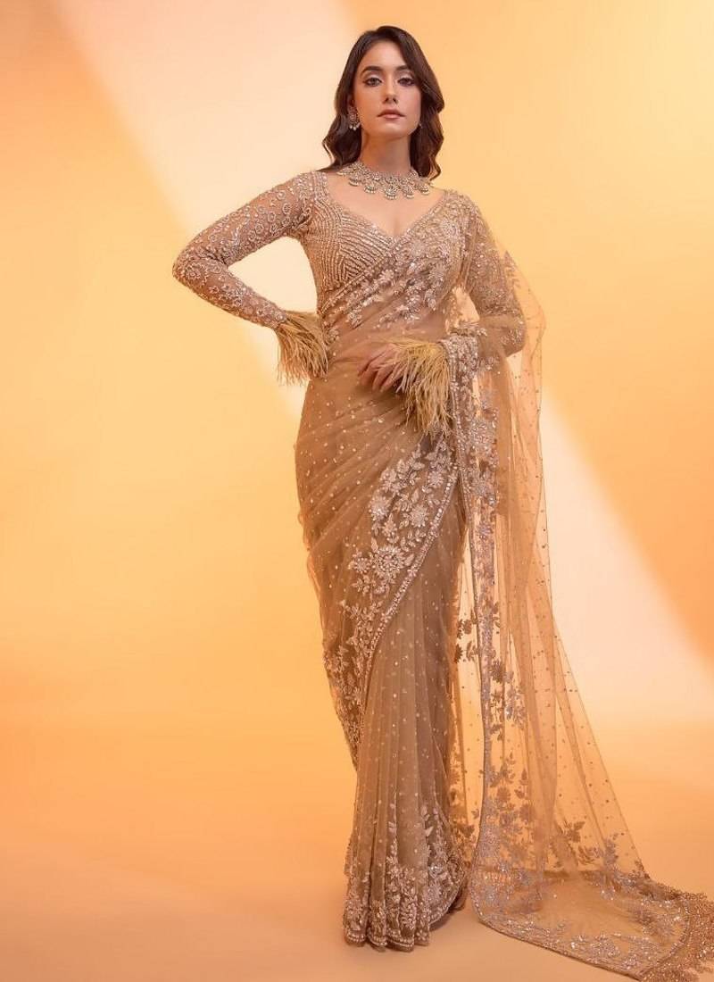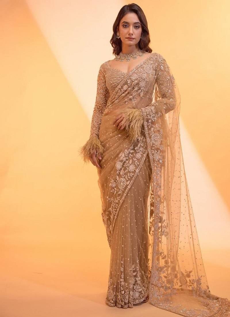 Light chiku color sequins & multy embroidery work butterfly net saree