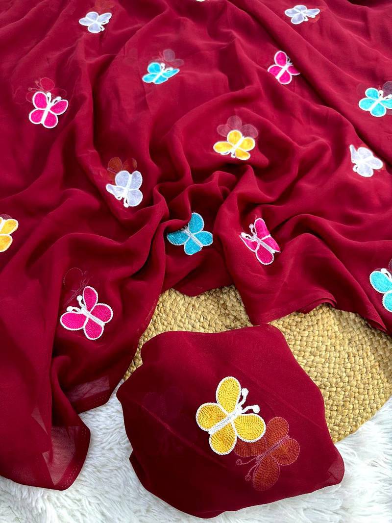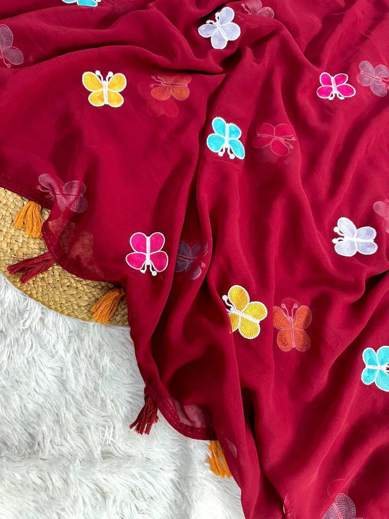 | Product Name | Maroon Color Tharede Gamthi Butterfly Work Georgette Saree | |