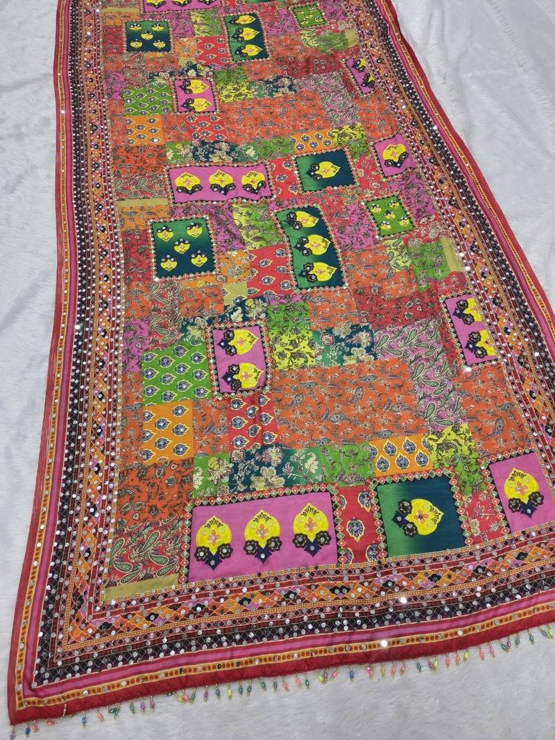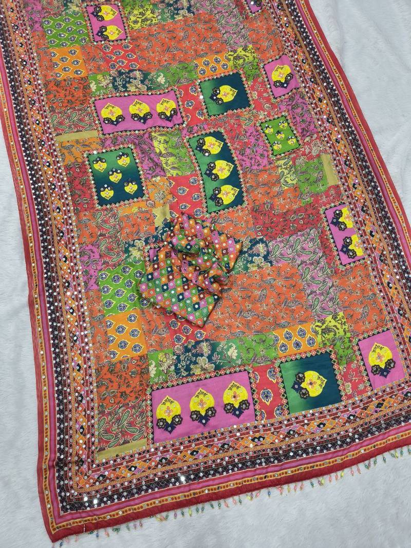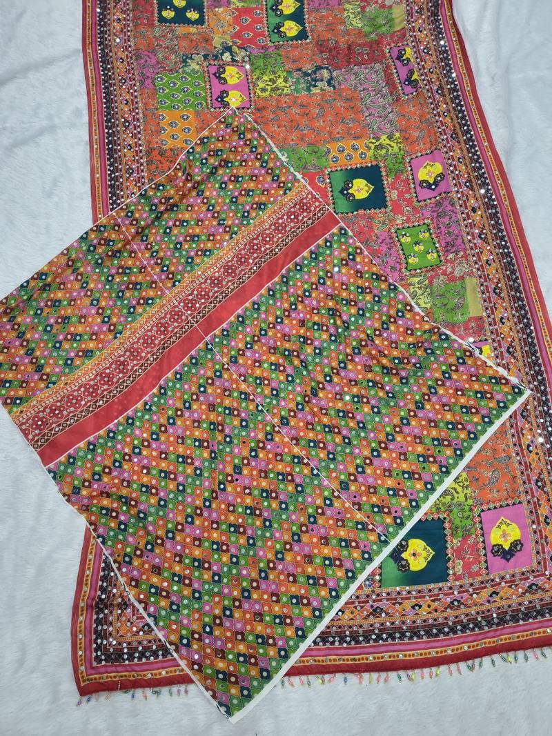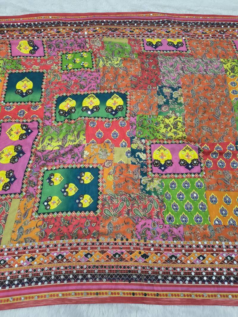Multi color print and real mirror work chinon silk saree
