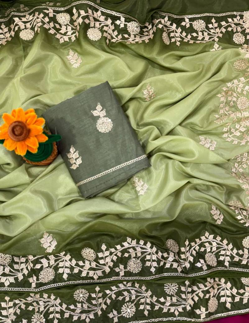 | Product Name | Olive Color Zari Thread And Sequence Chinon Silk Saree | |