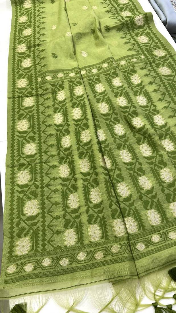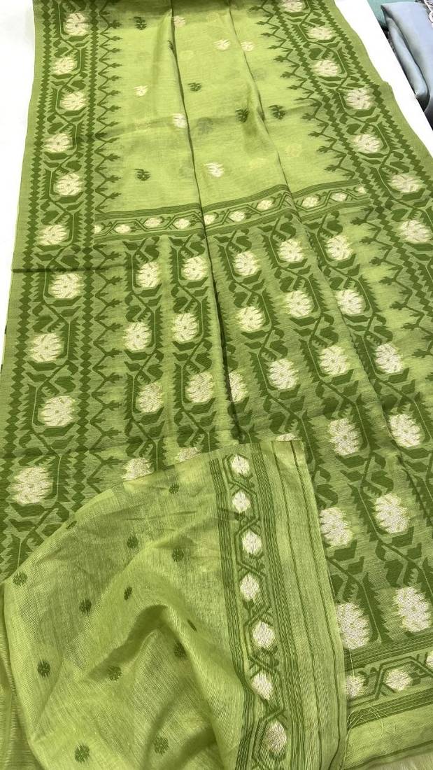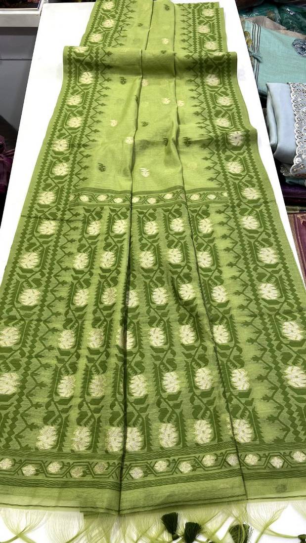 Parrot green color zari weaving butti work cotton saree
