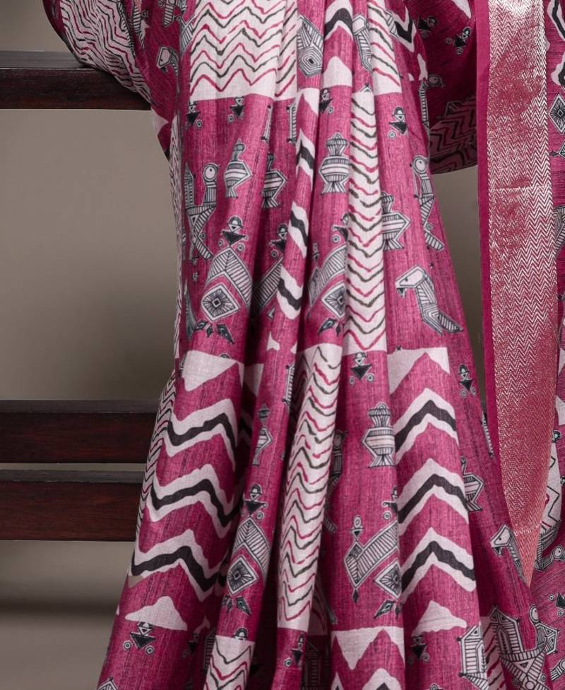 Pink color printed tasar silk with viscose border saree