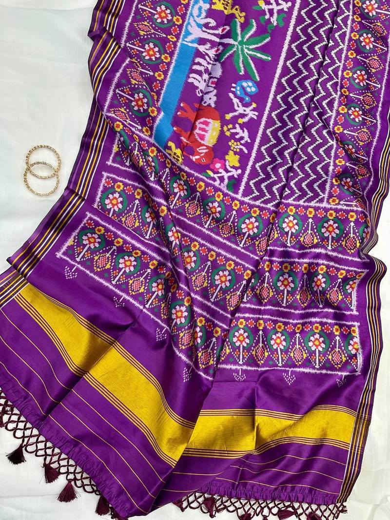| Product Name | Purple Color Patola Style Figure Print And Zari Lining Stripe Border Silk Saree | |
