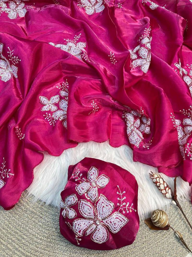Rani pink color embroidery sequence work organza saree