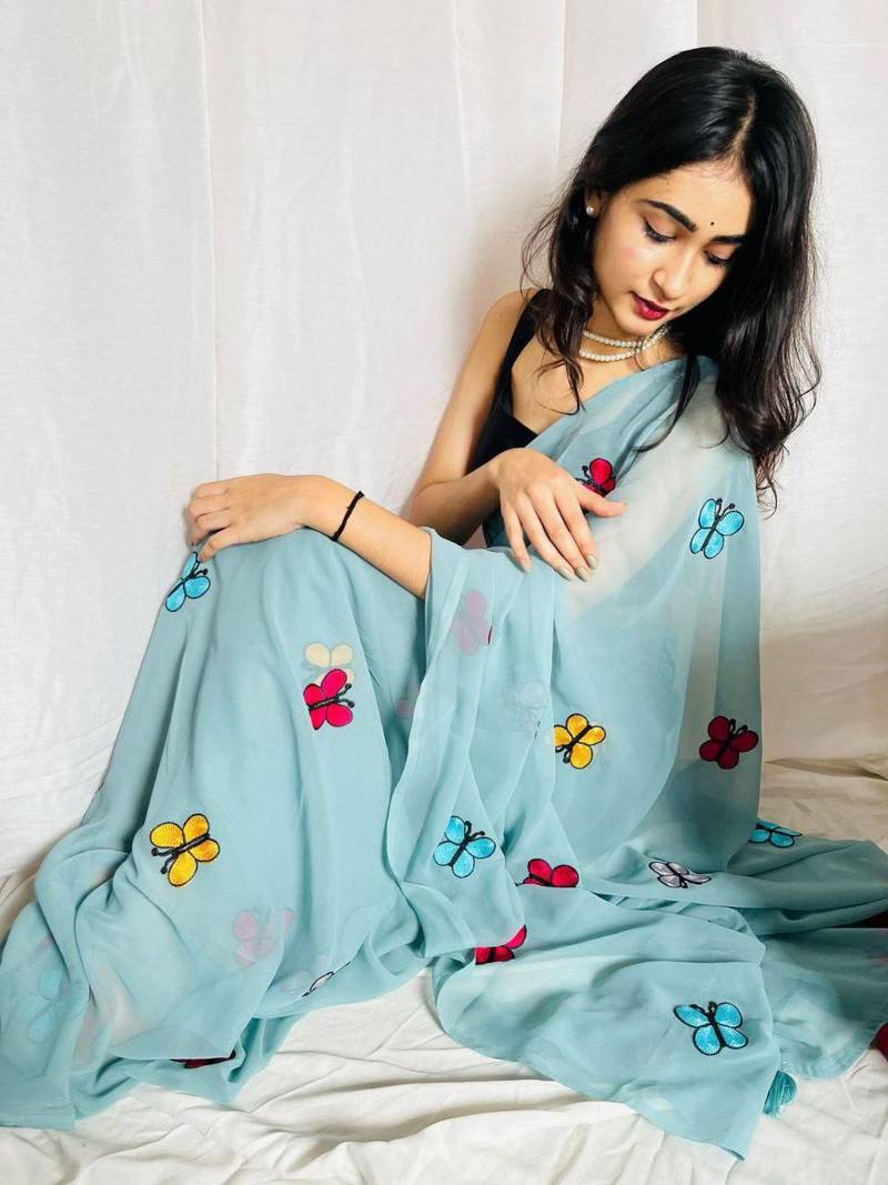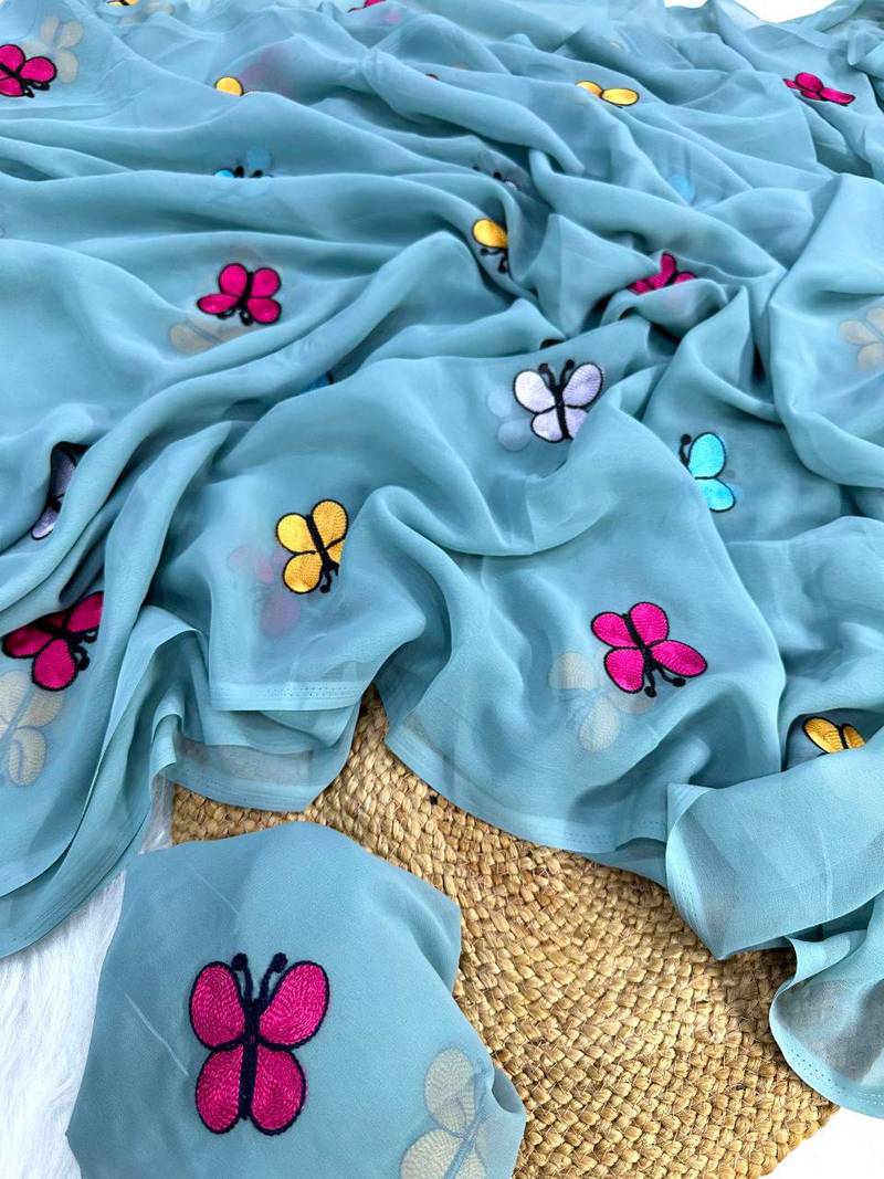 | Product Name | Sky Blue Color Tharede Gamthi Butterfly Work Georgette Saree | |