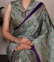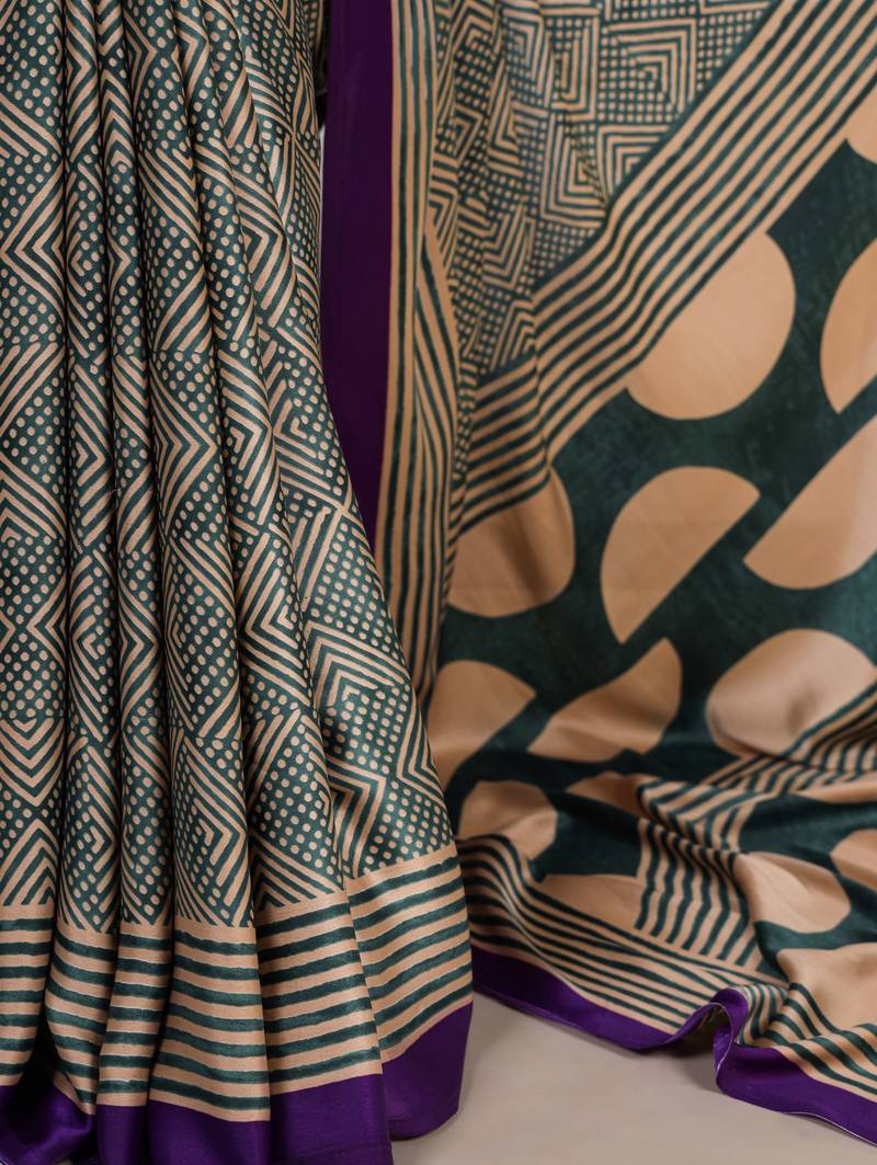 Teal color fancy printed dull satin saree