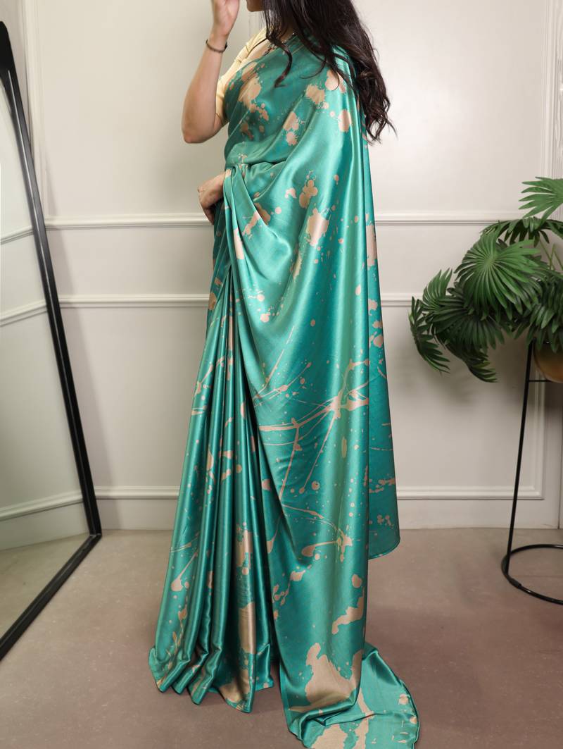 Teal color printed satin silk saree