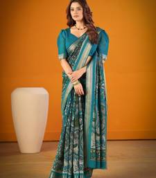 Teal color printed with zari weaving polyester viscose chanderi saree