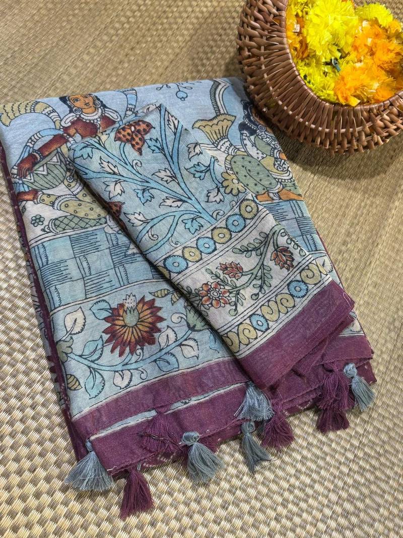 | Product Description | This Silk Linen Feel Saree Comes With A Beautiful Fusion Of Bandhani And Kalamkari Design, Along With Kalamkari Blouse Its Phunka (Tussels) Adds To The Product Quality. |