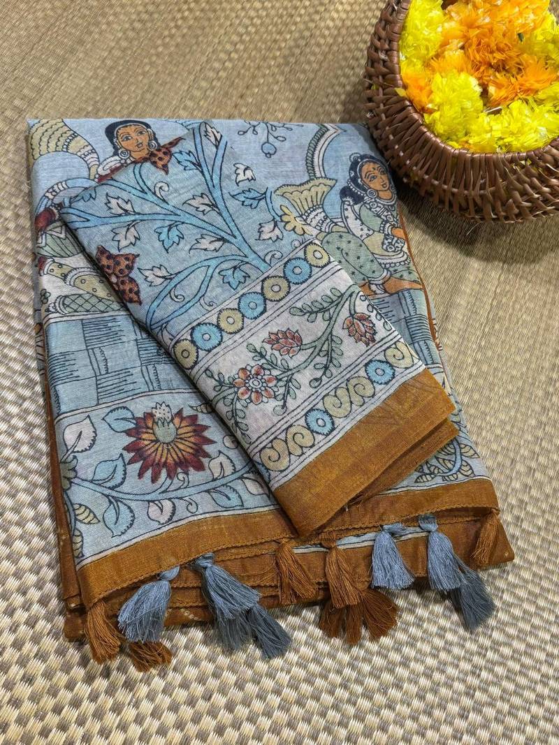 | Product Description | This Silk Linen Feel Saree Comes With A Beautiful Fusion Of Bandhani And Kalamkari Design, Along With Kalamkari Blouse Its Phunka (Tussels) Adds To The Product Quality. |