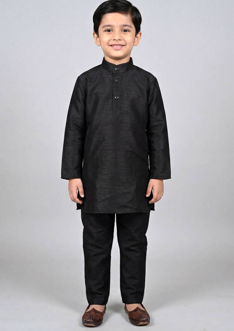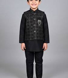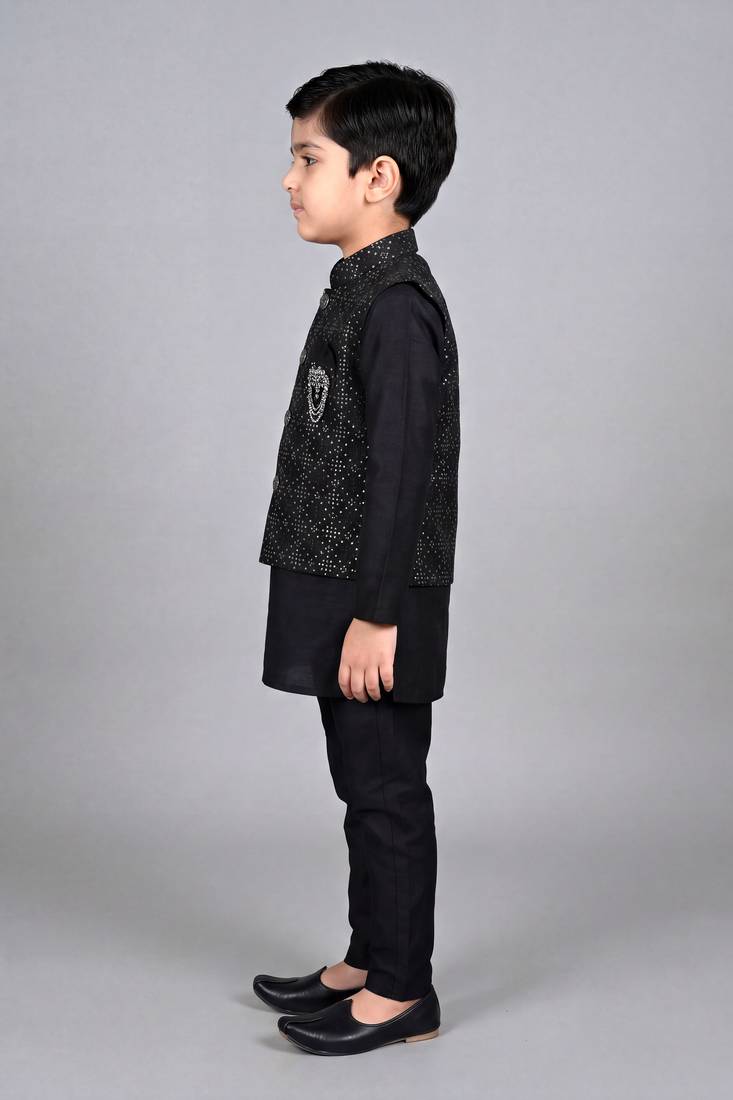 | Product Name | Boys Black Cotton Silk Kurta Pyjama Set With Geometric Sequined Embroidered Waistcoat | |