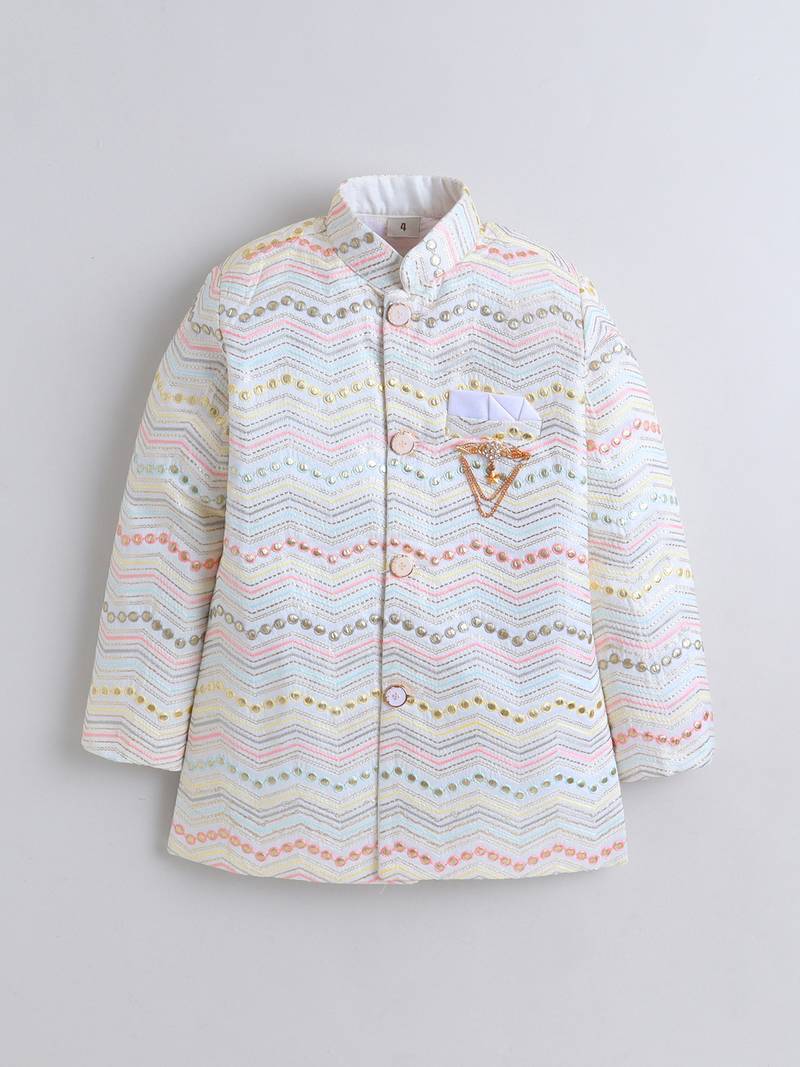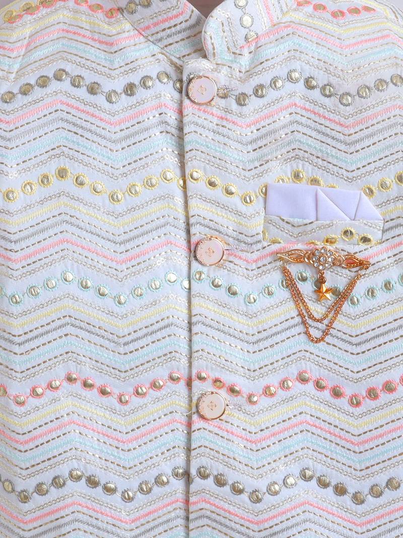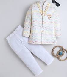 | Product Name | Boys Ivory Cotton Satin Chevron Zigzag Embroidered Sequined Sherwani & Trouser Set | |