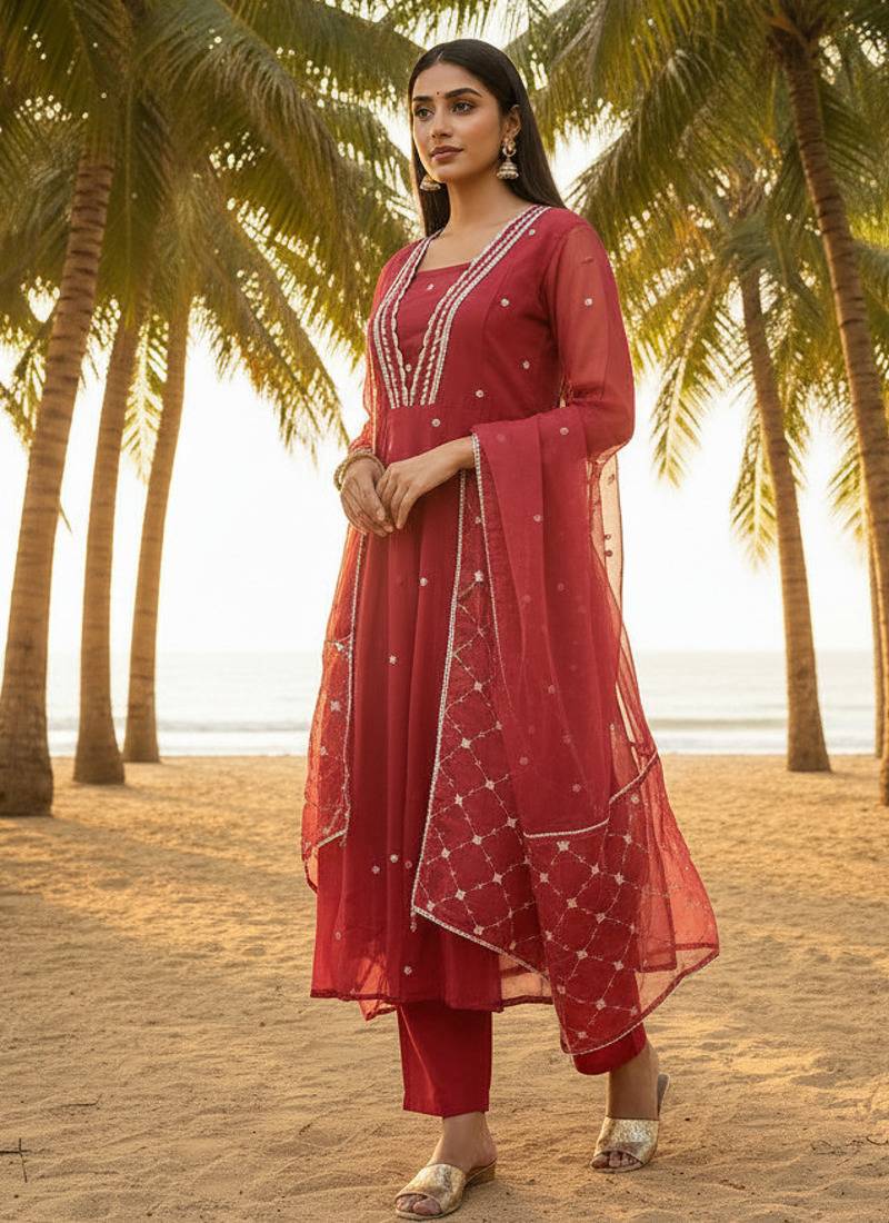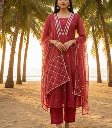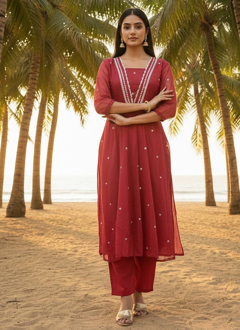 | Product Description | Elevate Your Ethnic Wardrobe With This Elegant Maroon Kurta Pant Set Crafted In Lightweight Organza. The Kurta Features A Graceful V Shape Neckline Enhanced With Delicate Lace Work, Paired With A Luxurious Pure Silk Pant And A Matching Organza Dupatta. Perfect For Festive Occasions, Family Gatherings, And Elegant Day Functions. |