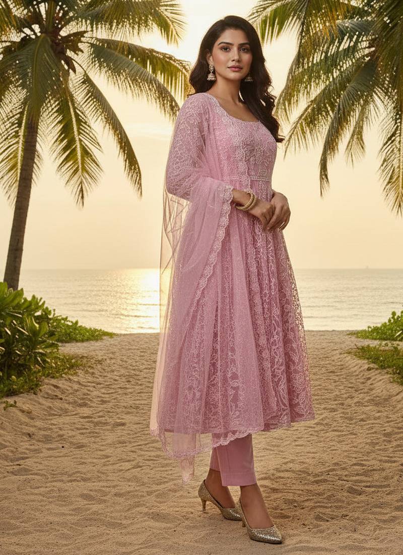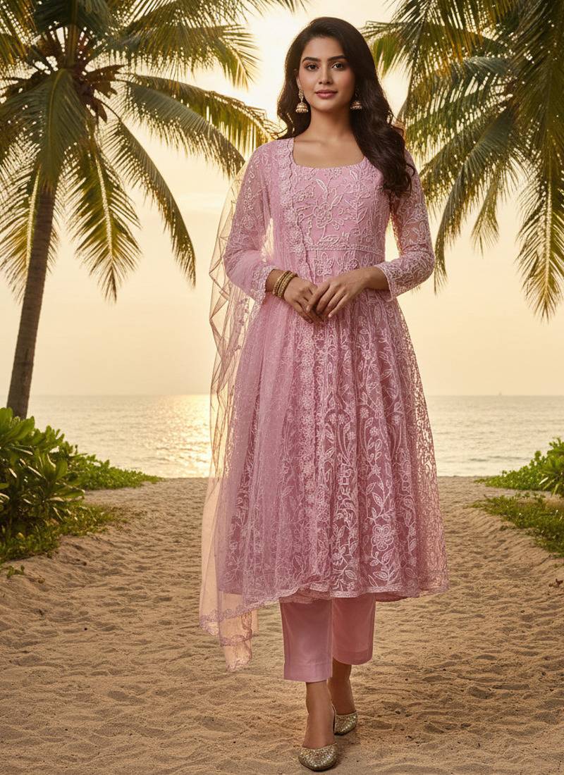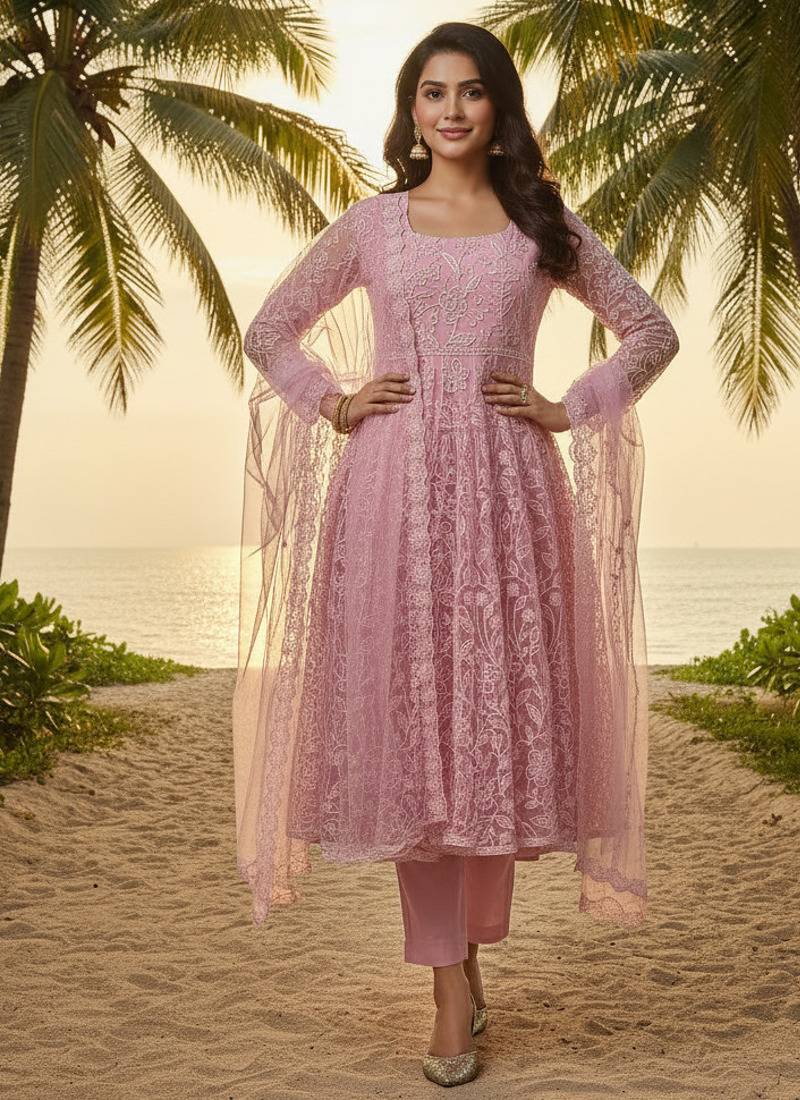 | Product Description | Elegant Dusty Rose Pink Kurta Set Featuring A Net Kurta With Inner Crepe Lining And White Lucknowi Chikankari Inspired Neck Work. Designed With A Square Neckline And Full Length Sleeves, Paired With A Soft Viscose Silk Pant And A Lightweight Net Dupatta. A Perfect Choice For Festive Gatherings, Family Functions, And Ethnic Occasions. |