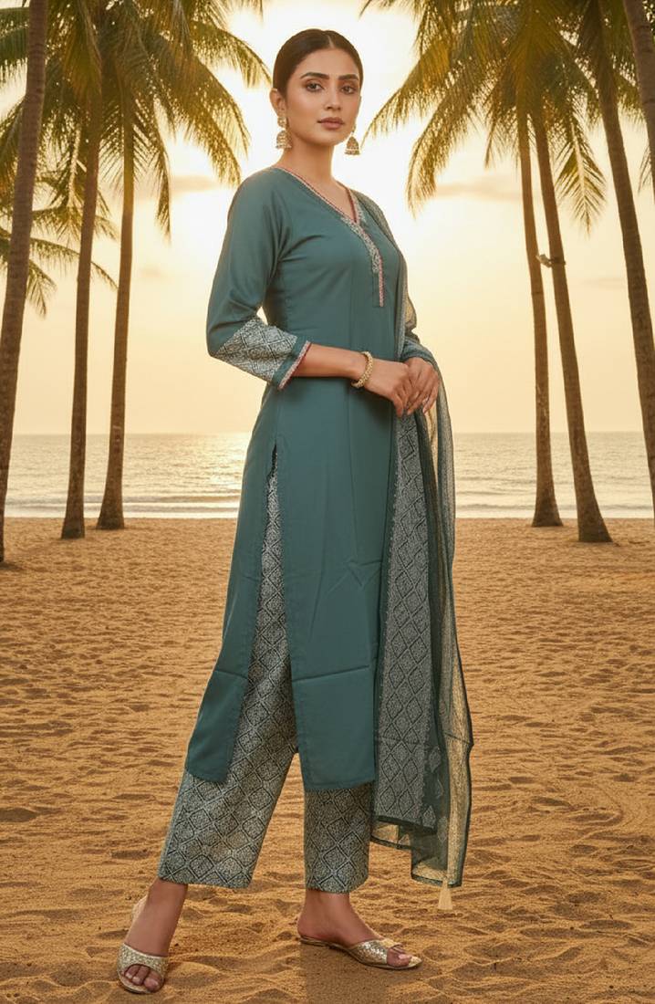 | Product Description | Elegant Women Grey Kurta Pant Dupatta Set Crafted In Soft Rayon Fabric. The Kurta Features A Stylish V Shaped Neckline Enhanced With Delicate Lace Work, Giving It A Graceful And Contemporary Look. Paired With Comfortable Rayon Pants And A Lightweight Taby Dupatta, This Set Is Perfect For Daily Wear, Office Wear, Casual Outings, And Small Gatherings. |