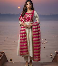 Label divine attire women off white & red silk blend embroidered kurta pant set with chanderi dupatta