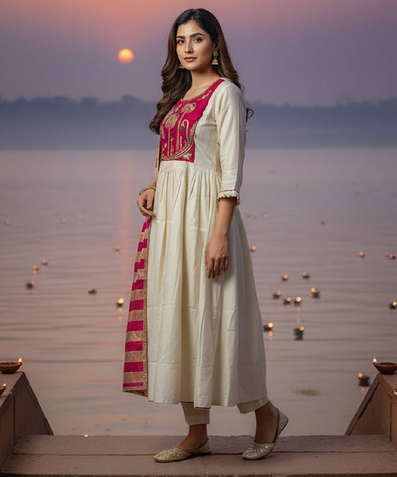 | Product Description | Elegant Off White And Red Kurta Pant Set Crafted In Silk Blend Fabric Featuring Heavy Embroidery Work On The Neckline. Paired With A Matching Silk Blend Pant And A Graceful Chanderi Dupatta, This Set Offers A Perfect Blend Of Traditional Charm And Contemporary Style For Festive And Ethnic Occasions. |