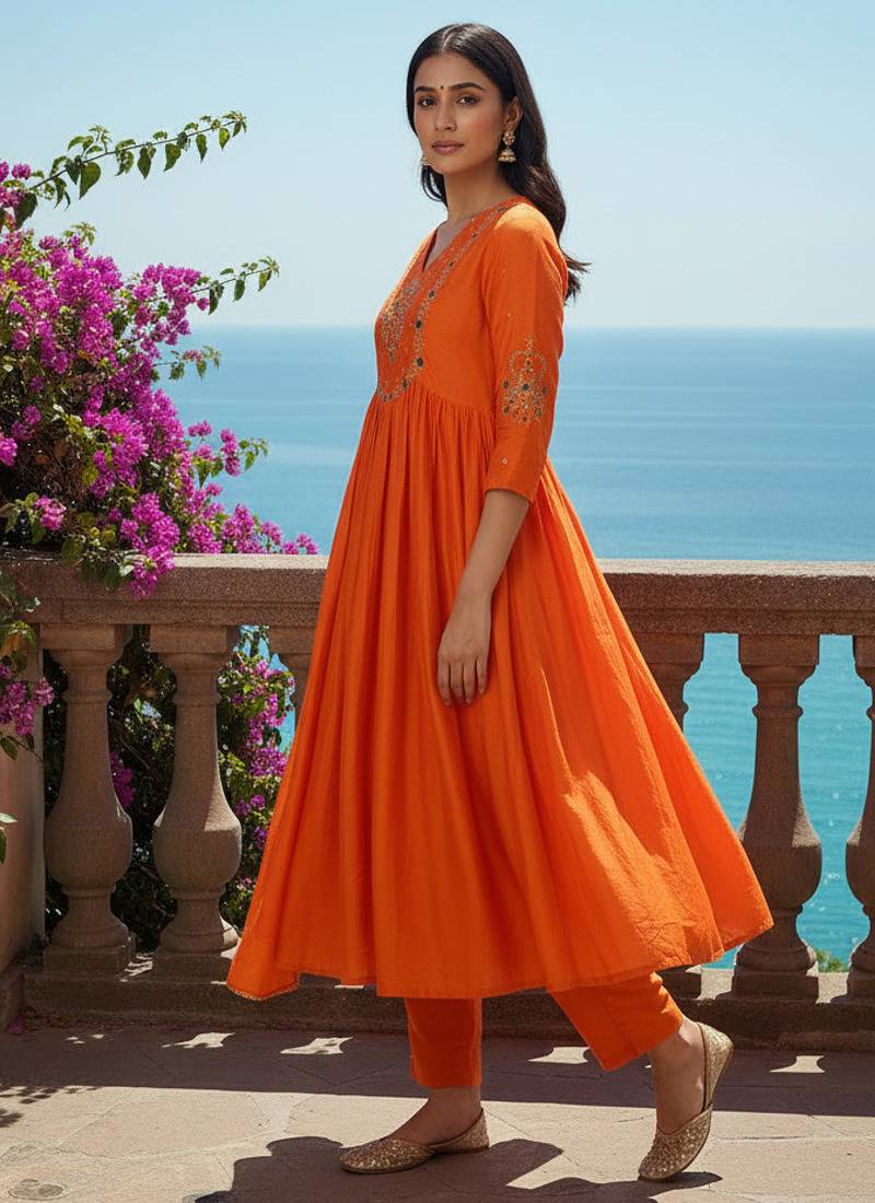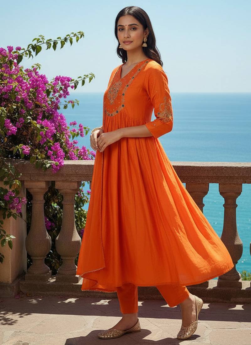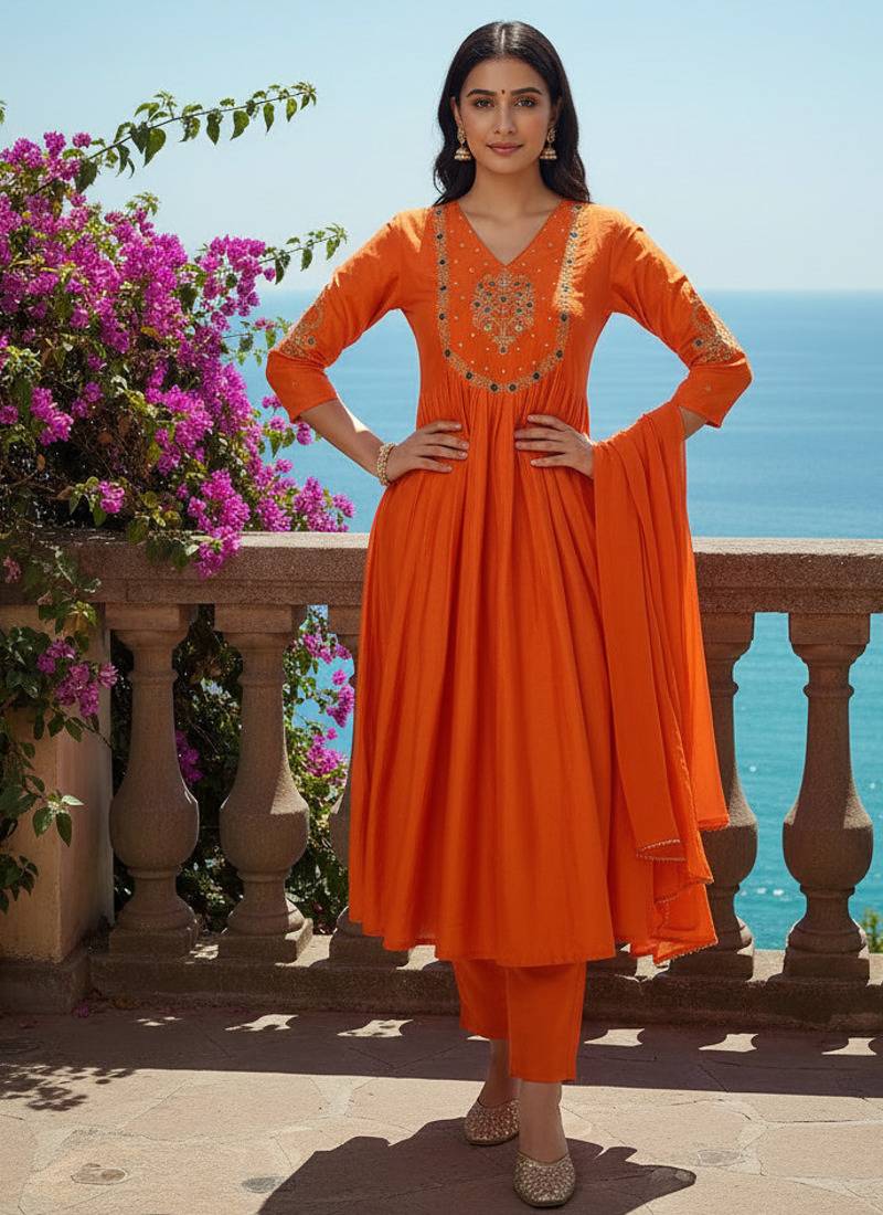 | Product Description | Women Orange Silk Blend Kurta Set Featuring V Shape Neck With Heavy Golden And Multicolor Thread Embroidery Work On Neck And Sleeves, Paired With Matching Silk Blend Pant And Dupatta, Ideal For Festive And Ethnic Occasions |