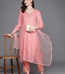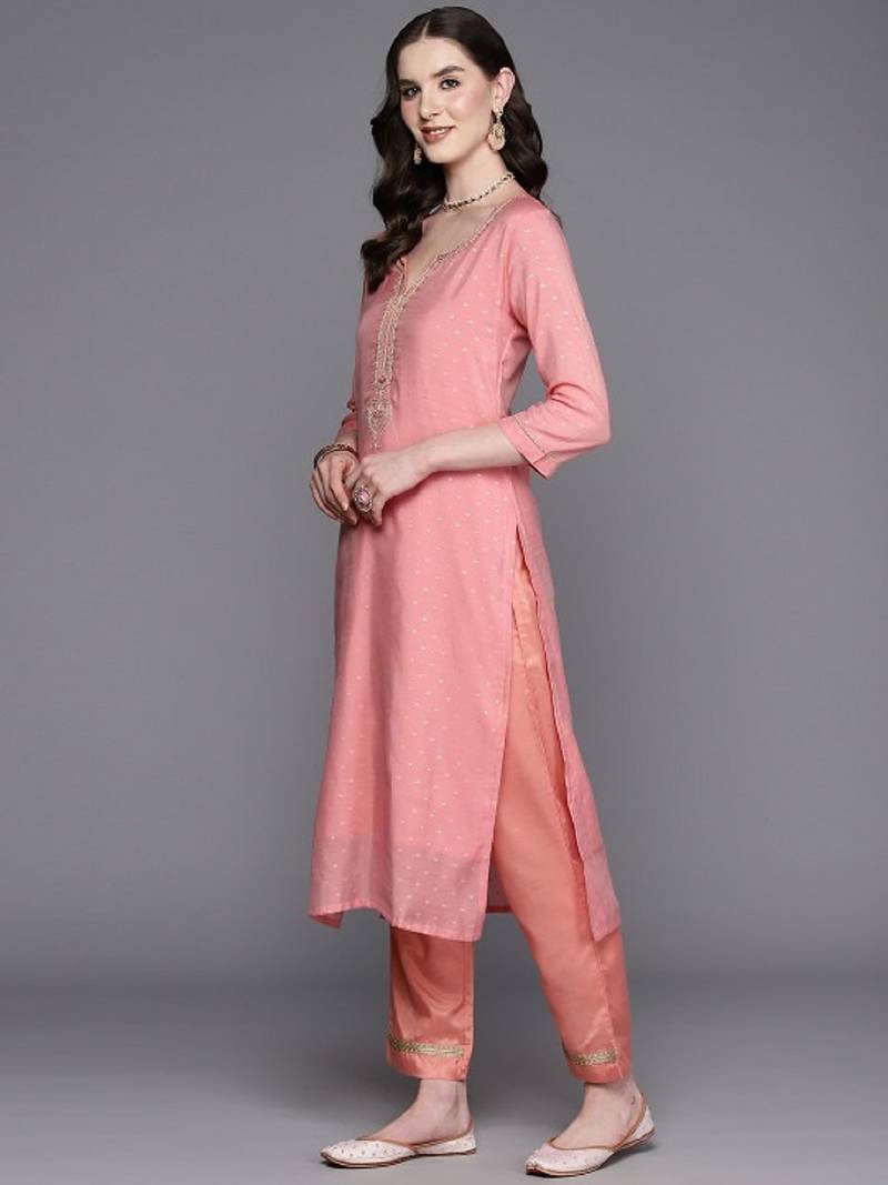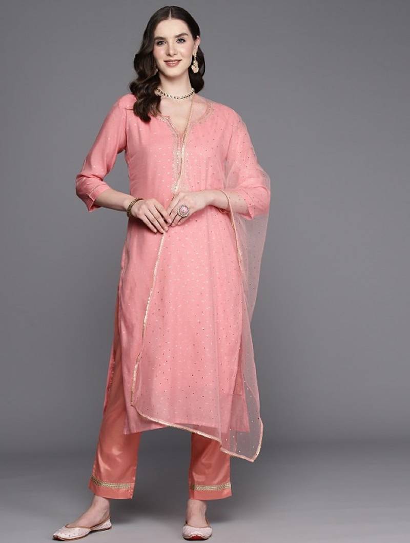 | Product Name | Label Divine Attire Women Peach Chanderi Silk Embroidered Kurta Pant Set With Shimmer Net Dupatta | |