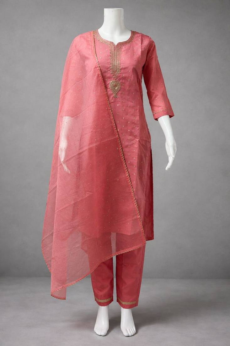 | Product Description | Elegant Women Peach Kurta Pant Set Crafted In Premium Chanderi Silk Featuring Golden Thread Embroidery On The Neck, Paired With A Matching Silk Blend Pant And A Lightweight Shimmer Net Dupatta, Perfect For Festive And Special Occasions |