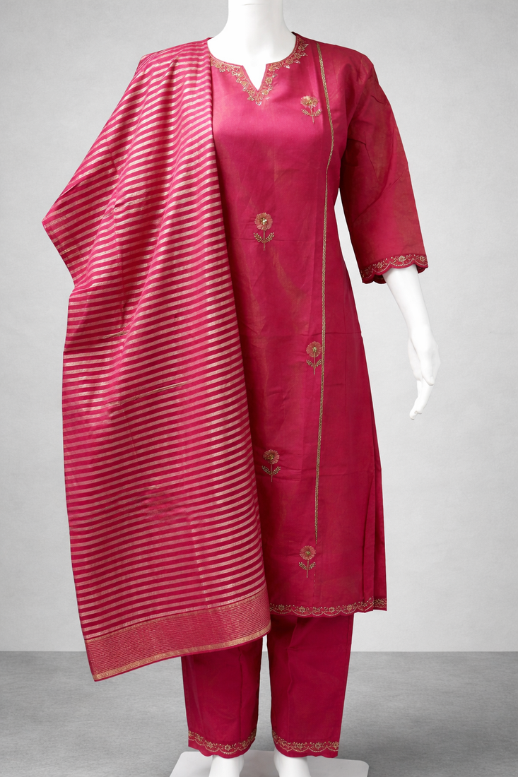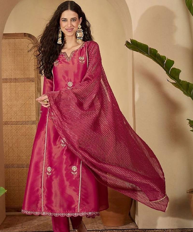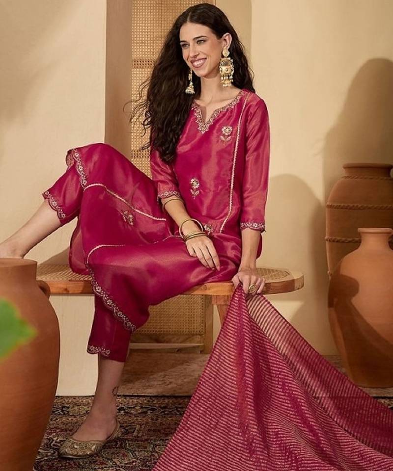 | Product Description | Elevate Your Festive And Occasion Wear Look With This Elegant Pink Kurta Pant Dupatta Set. Crafted In Premium Shimmer Silk Blend Fabric, The Kurta Features Beautiful Sequins And Thread Embroidery On The Neckline And Sleeves, Accentuated With Delicate Floral Work All Over. Paired With A Comfortable Matching Pant And A Graceful Shimmer Silk Blend Dupatta, This Set Offers A Perfect Blend Of Style, Comfort, And Sophistication For Festive, Wedding, And Special Occasions. |