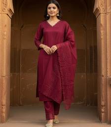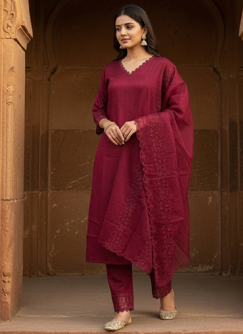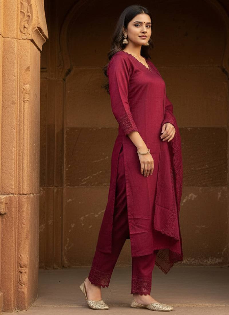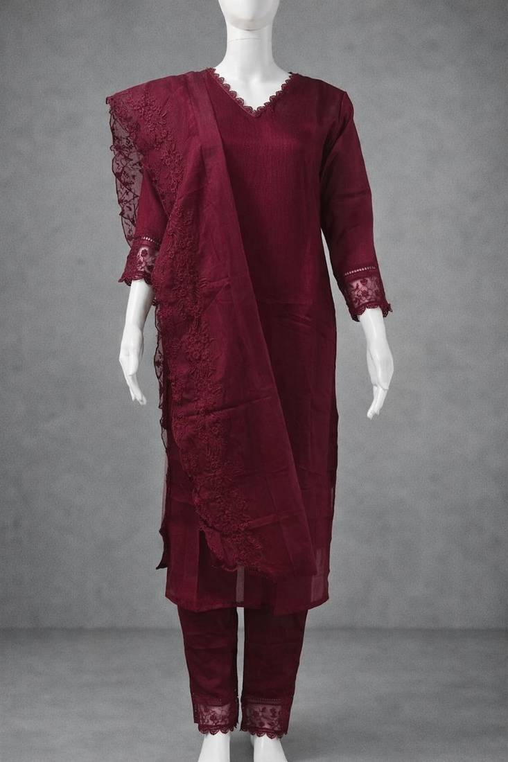 | Product Name | Label Divine Attire Women Wine Silk Blend Embroidered Kurta Pant Set With Organza Dupatta | |
