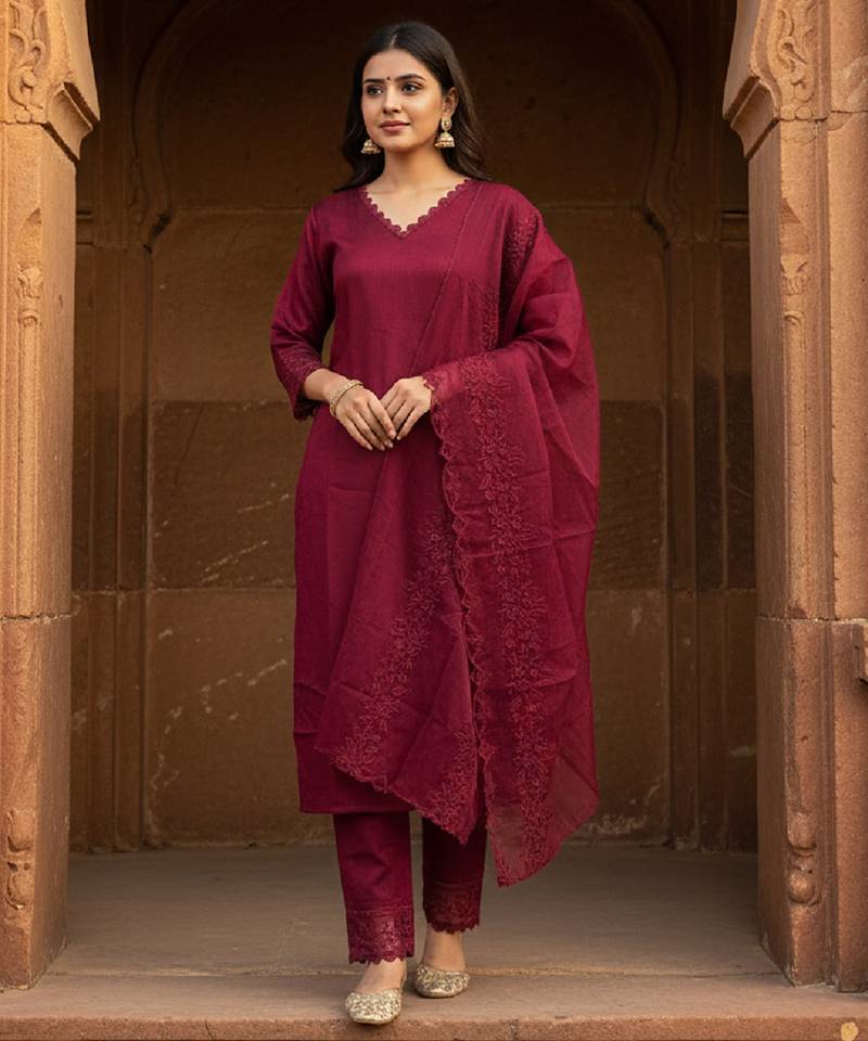 | Product Description | Elevate Your Ethnic Wardrobe With This Elegant Wine Kurta Pant Set Crafted In Luxurious Silk Blend Fabric. The Kurta Features A Flattering V Shape Neckline Adorned With Heavy Thread Embroidery On The Neck And Sleeves, Adding A Rich Festive Touch. Paired With A Matching Silk Blend Pant And A Lightweight Organza Dupatta, This Set Is Perfect For Festive Wear, Wedding Functions, And Special Occasions. |