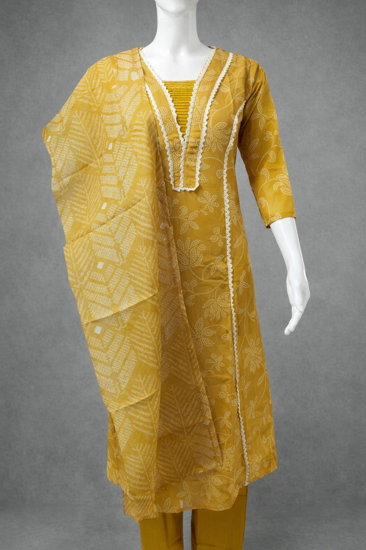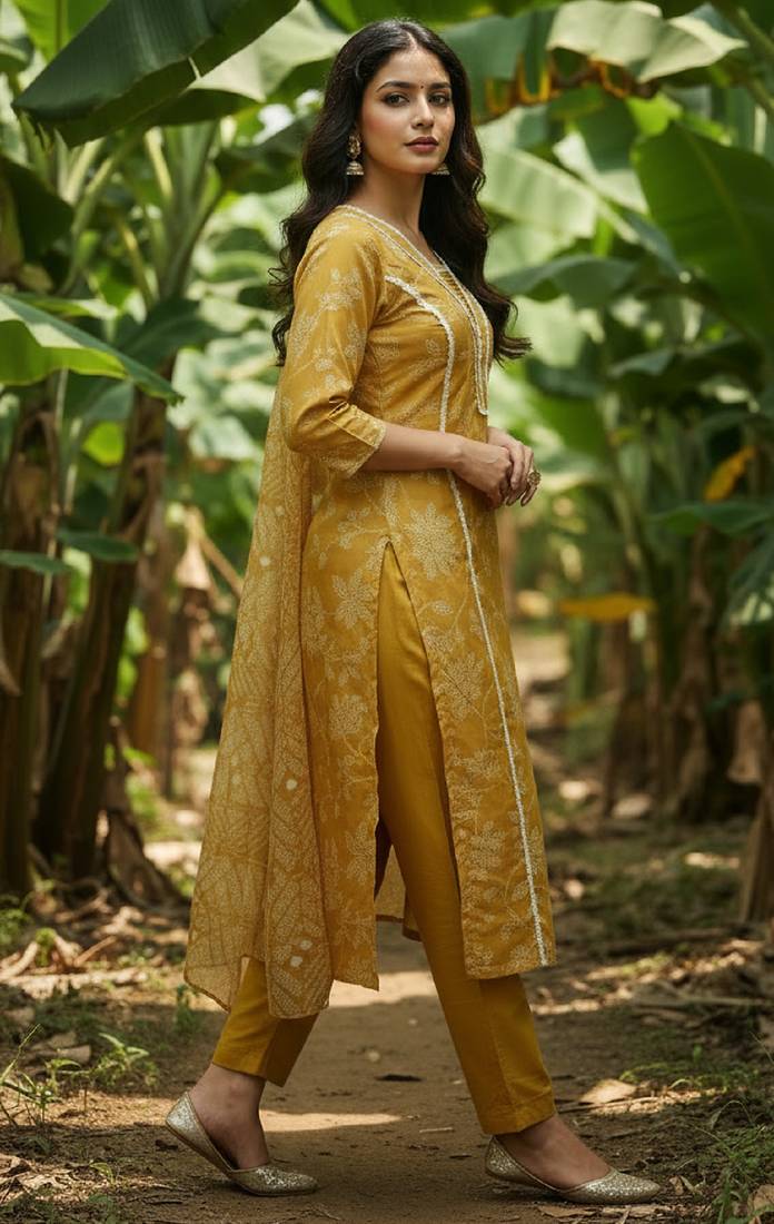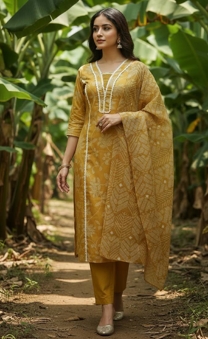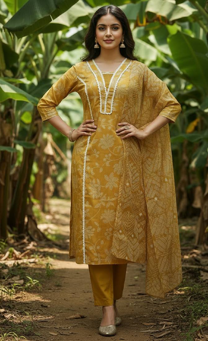 | Product Description | Graceful And Comfortable Yellow Kurta Pant Set Crafted In Soft Rayon Fabric. The Kurta Features An Elegant V Shape Neckline Accentuated With Delicate Lace Work, Paired With Matching Rayon Pants And A Lightweight Taby Dupatta. Perfect For Daily Wear, Casual Outings, Office Wear, And Small Gatherings. |